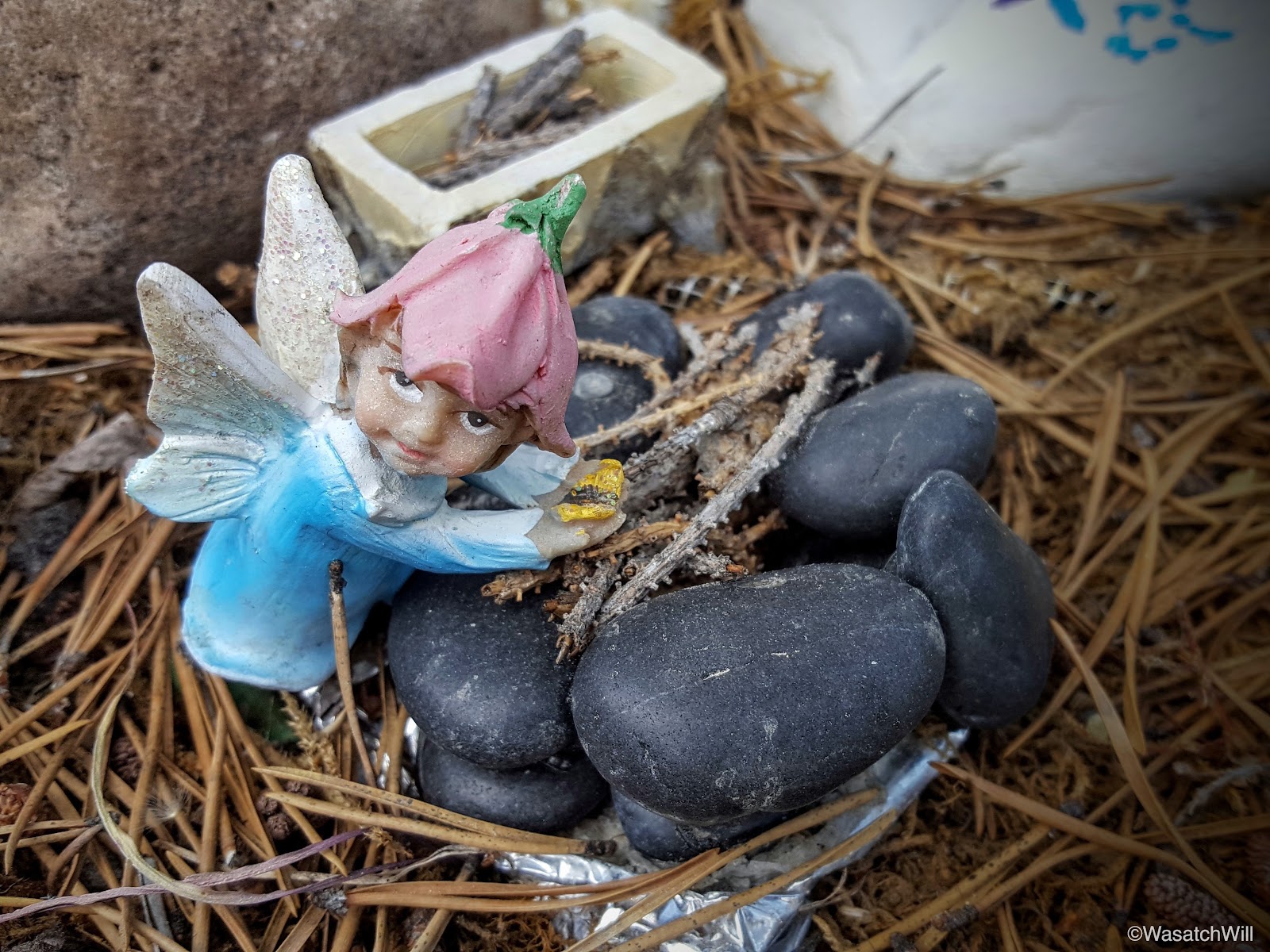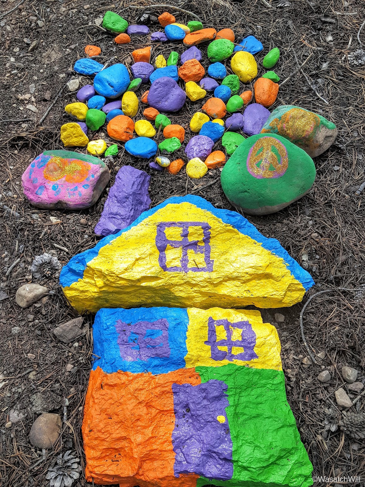 We had intended to paint some rocks at our home to bring up and add to the collection, but ran out of time with all of our other preparations we had to make. Inspired by some other displays that had been created out of nothing but natural materials there, our kids found a spot on the outer edge to build their own little fairy house.
