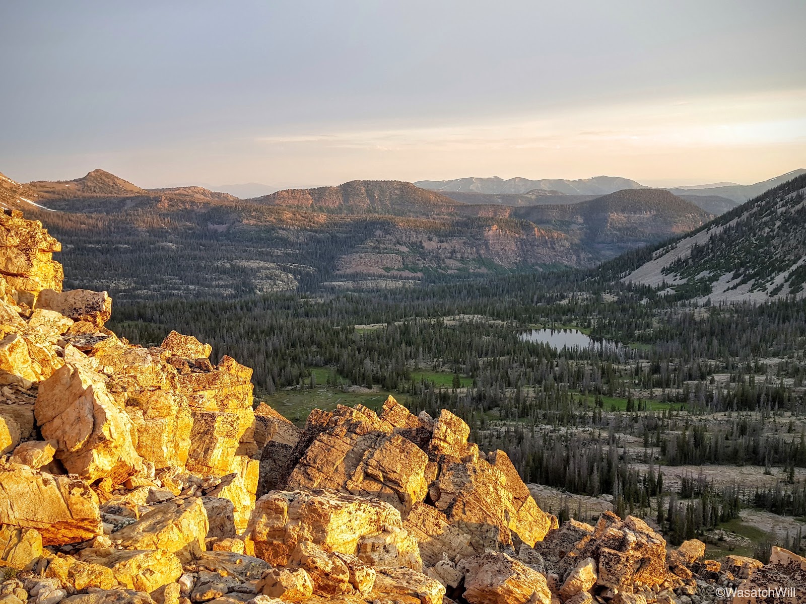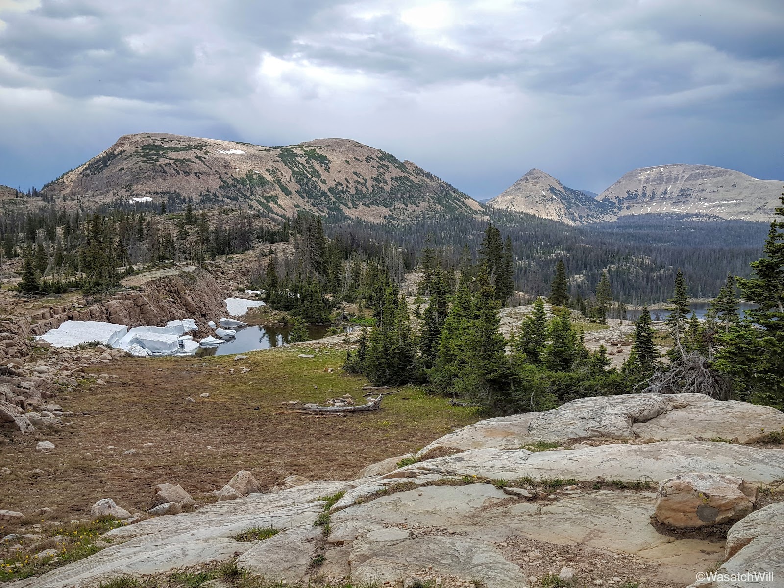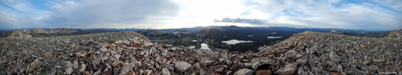 From the summit: lots of lakes and the High Uintas range on the horizon