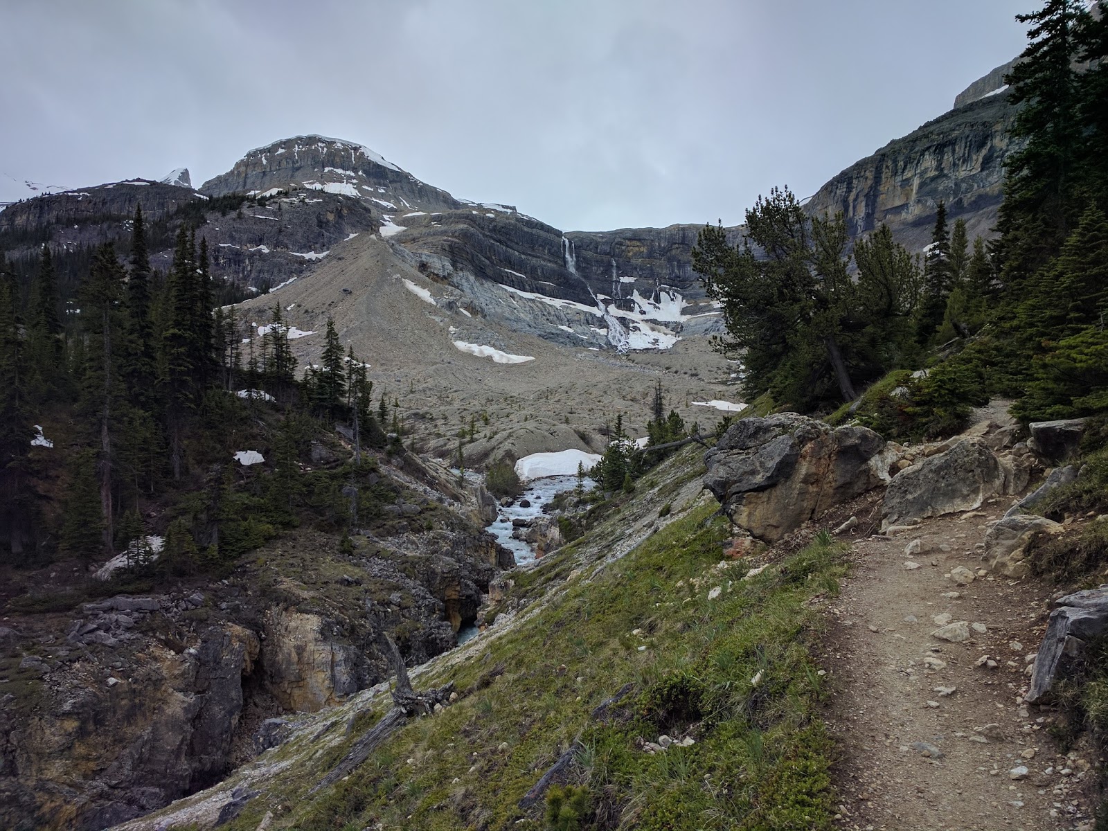 We headed up the trail towards Bow Glacier Falls. You can just see the falls in the middle of the photo below.