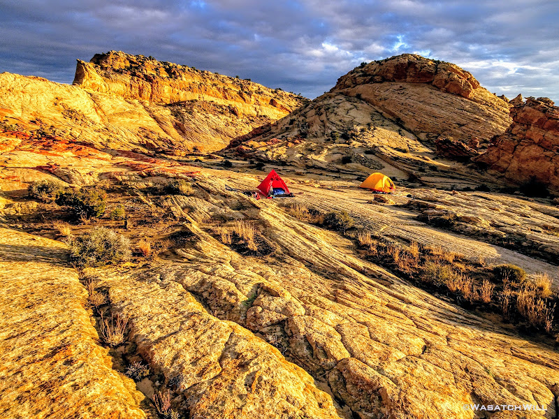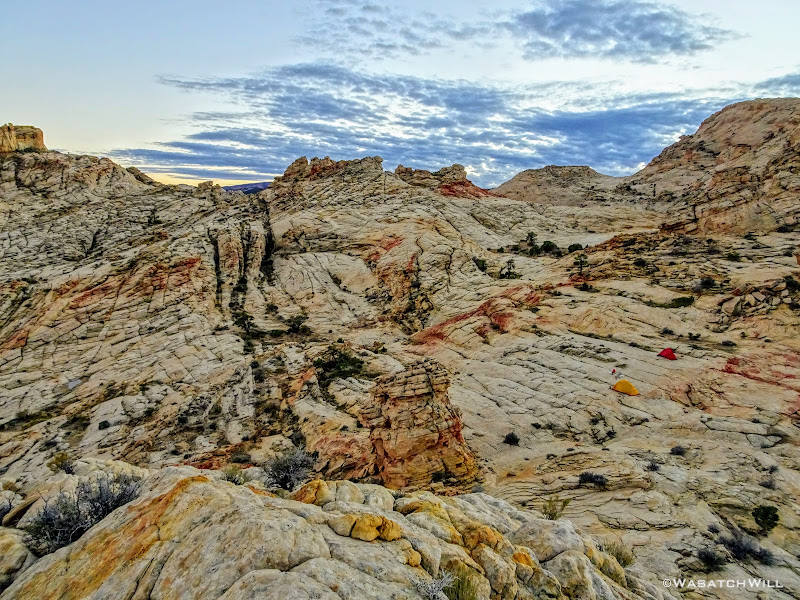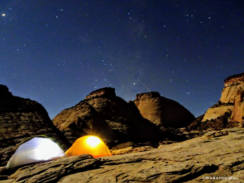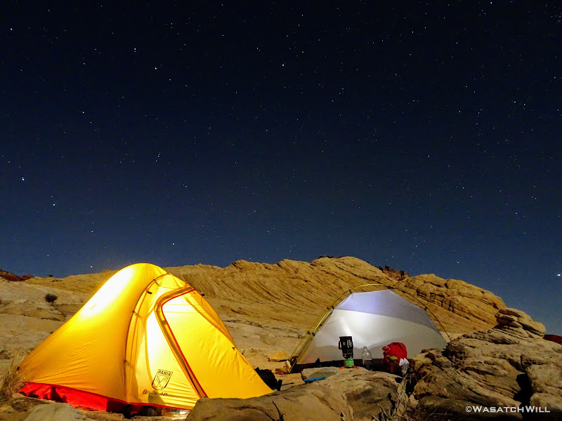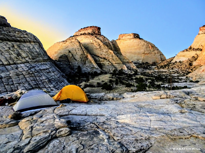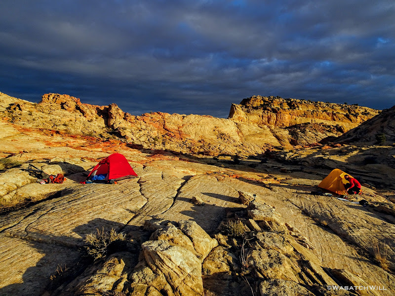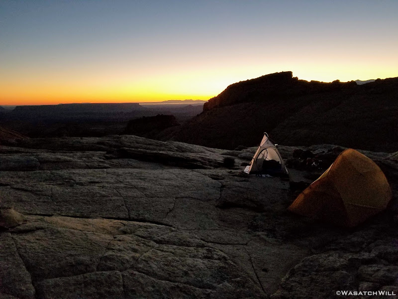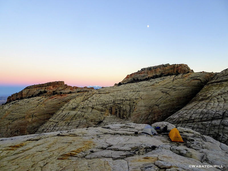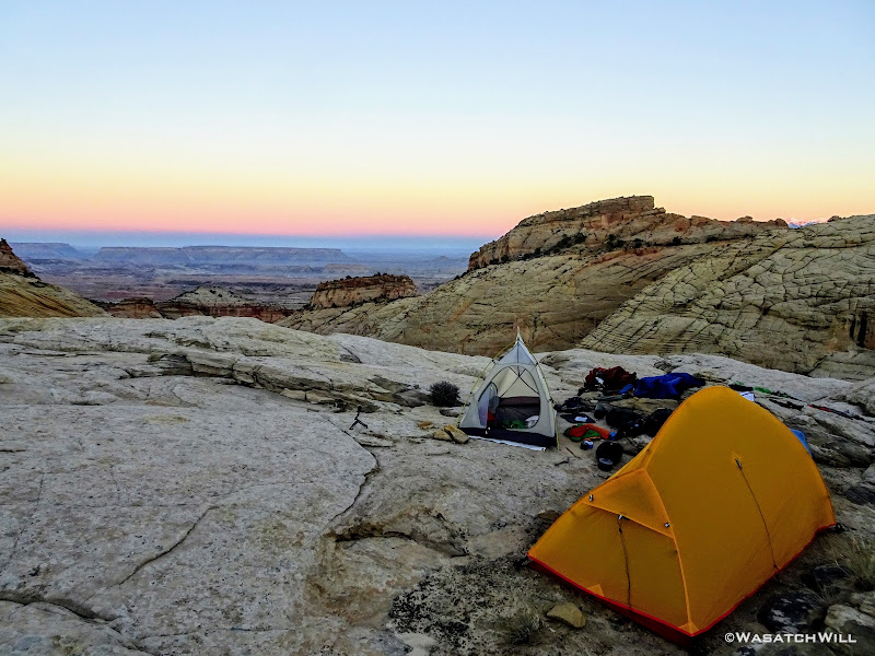 Once up the other side of the basin, we settled on a nice slickrock flat along a saddle between the basin we had just cut through and yet another basin lying to the south below us. There we made camp, and found a nearby shallow pool of water from which we filtered what we needed. And then, for the first and only time of the trip, we enjoyed our dinner before dark. And once again, we were spoiled with incredible views all around.