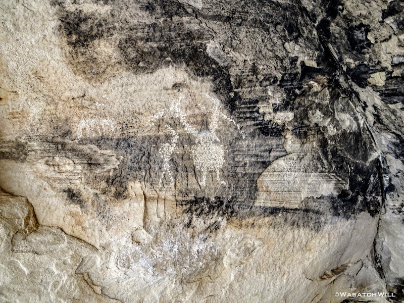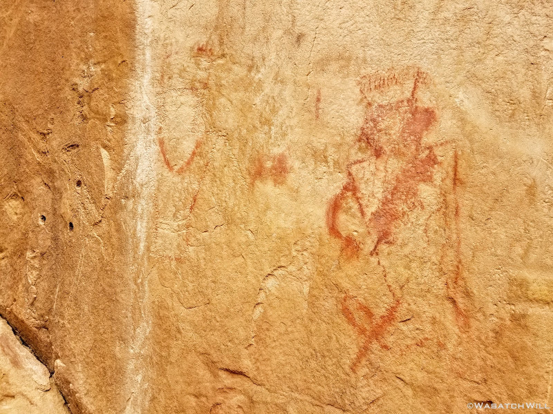 En route along the creek, Devin's keen eye spotted yet another panel of rock art. Of course, we jumped the creek and had ourselves a good up-close look. Having passed by this spot 3 different times before, I had not known of them. A set of four or five Fremont figures, almost uniform in size and appearance, were clearly the key subjects in whatever story or memorial was carved out and painted here, for the panel consisted of both petroglyphs and some pictographs.