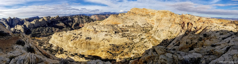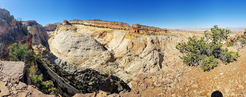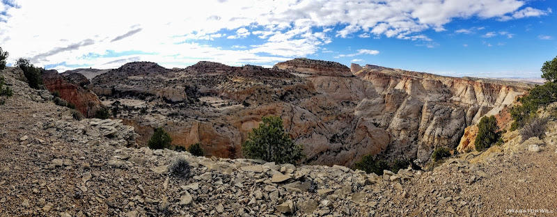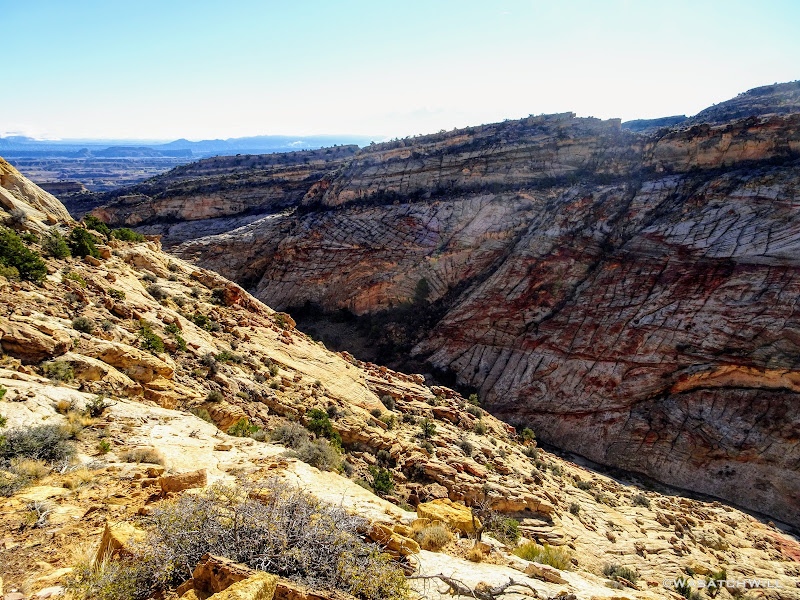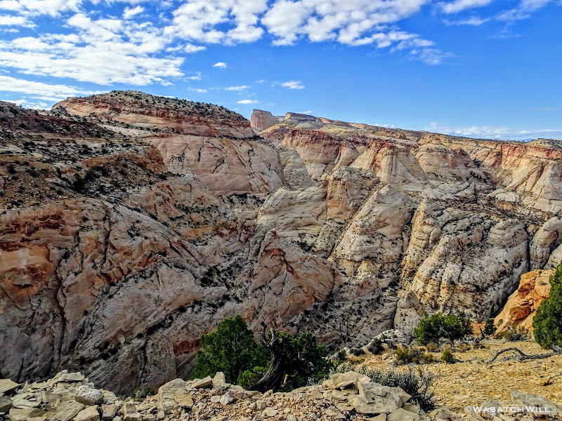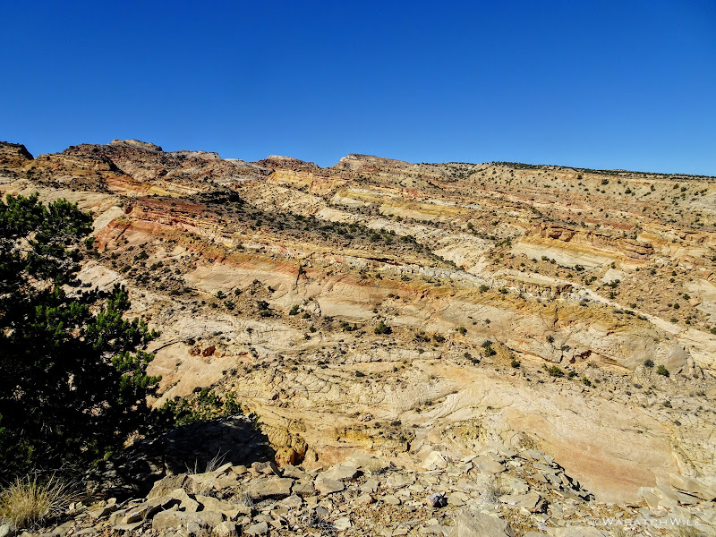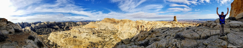 Soon after, we left the low lying Capitol Wash in pursuit of higher ground once again. This time being a 2.5 mile slog to gain 1100 feet. I knew what to brace myself for but this particular afternoon was more of a mental challenge on Devin than any other part of the trip. It wasn't very strenuous and certainly no major obstacles. It was just long and hot with little change in the terrain and scenery until the end. But...then, we finally hit a rim with yet another amazing overlook allowing us to see across the canyons we had just cut through that morning. It was another nice, hard-earned reward that served to recharge our spirits, every bit as breathtaking as I remembered it from the year before.