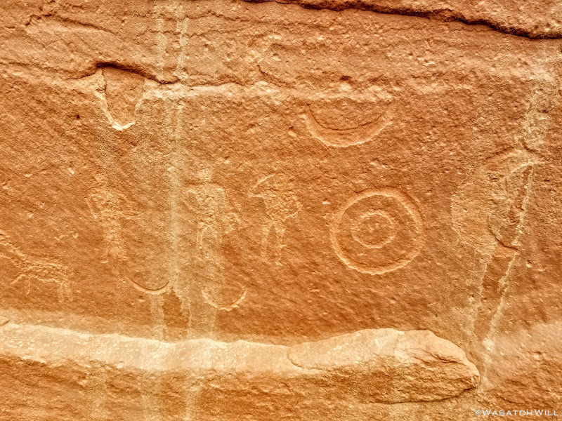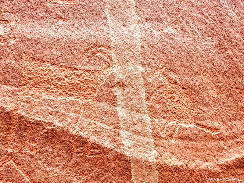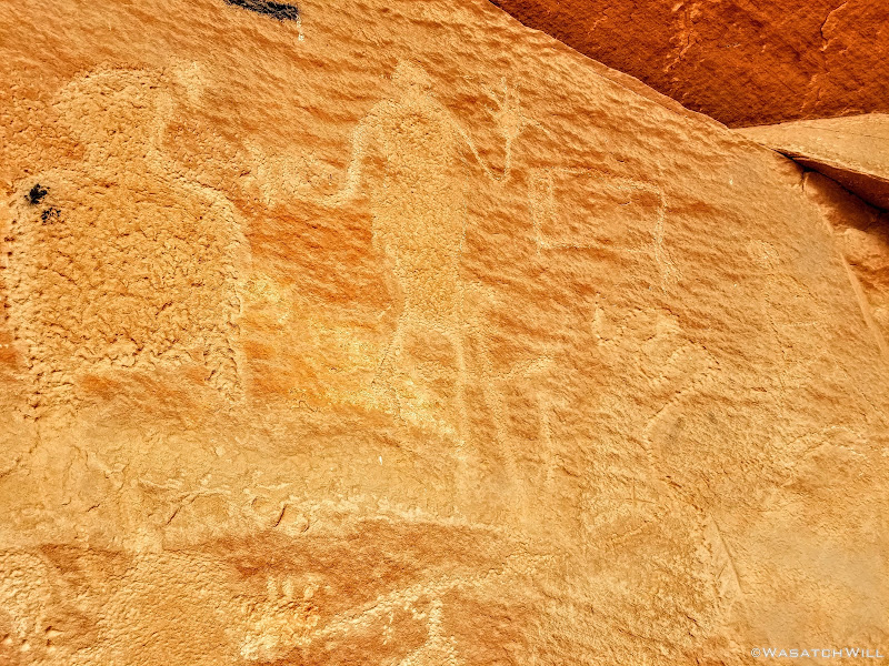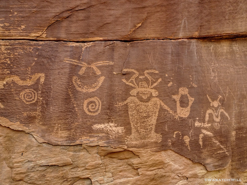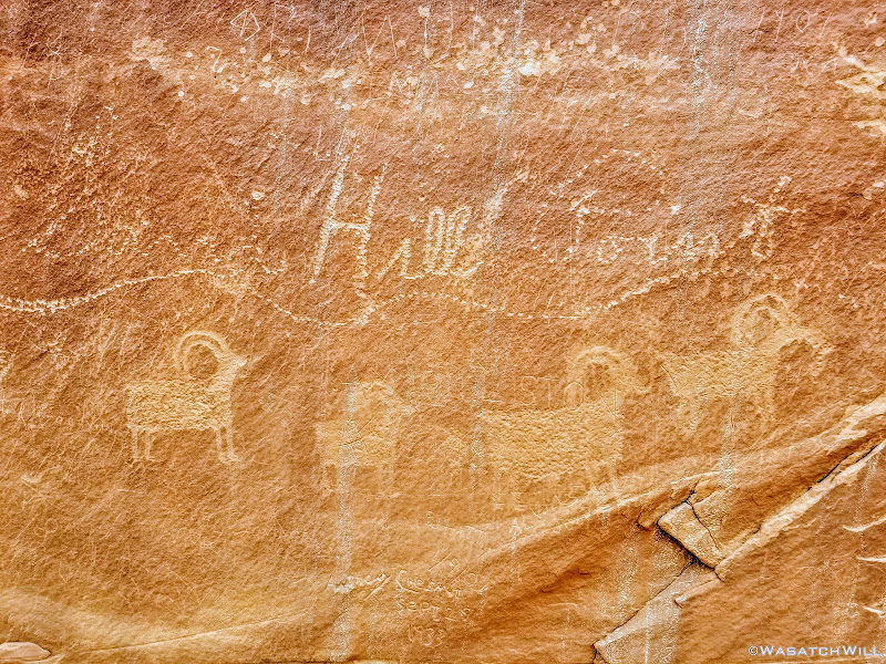 Further along the wall was another panel of petroglyphs I had found on the June visit. Mingling with the ancient Fremont art are some pioneer inscriptions of the late 1800's and early 1900's.