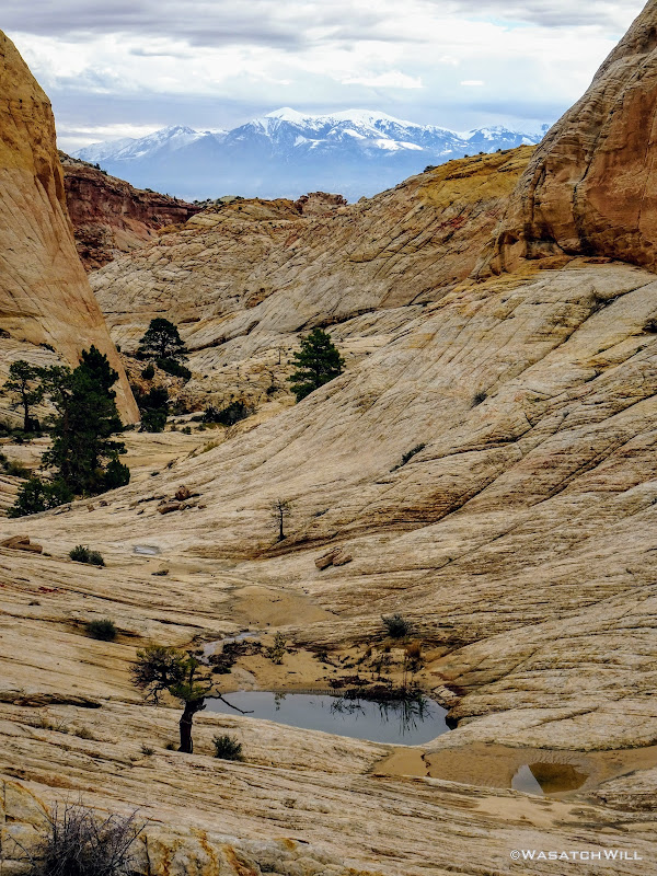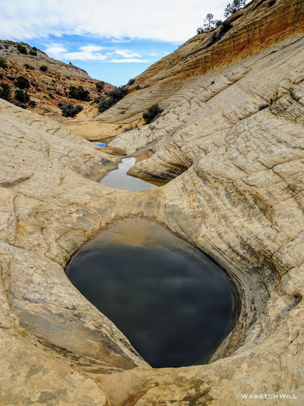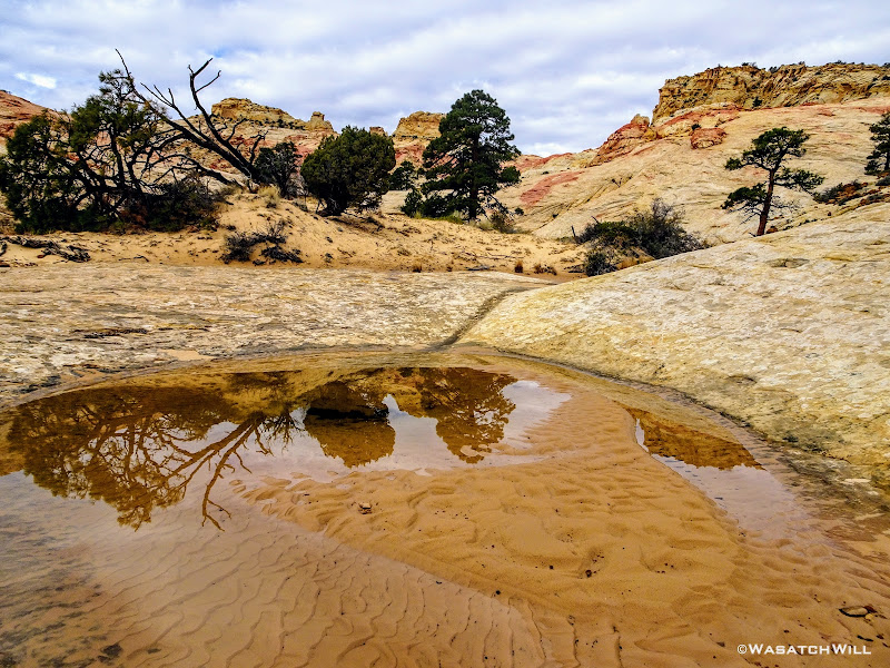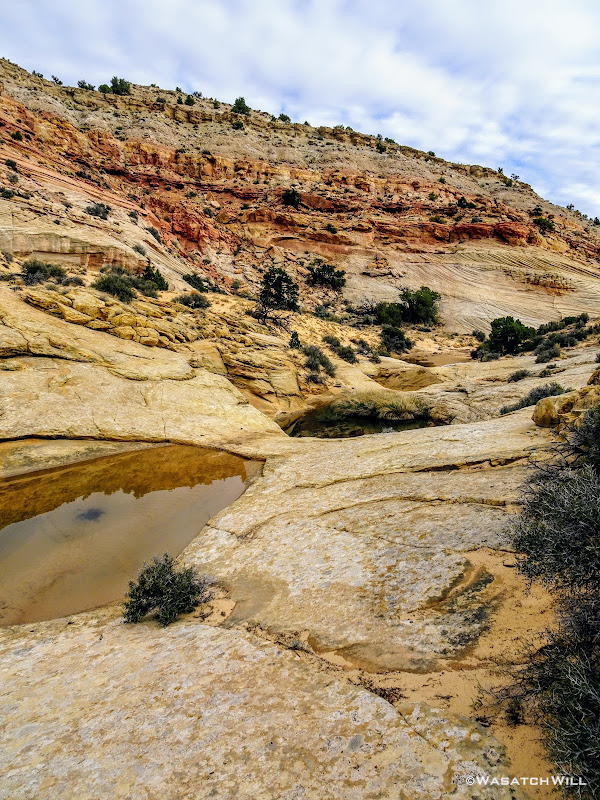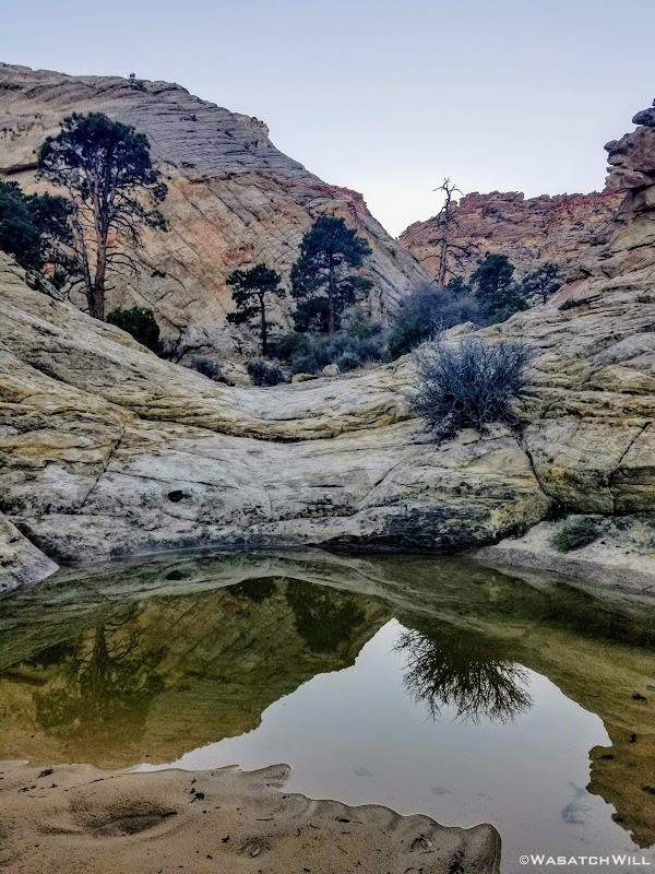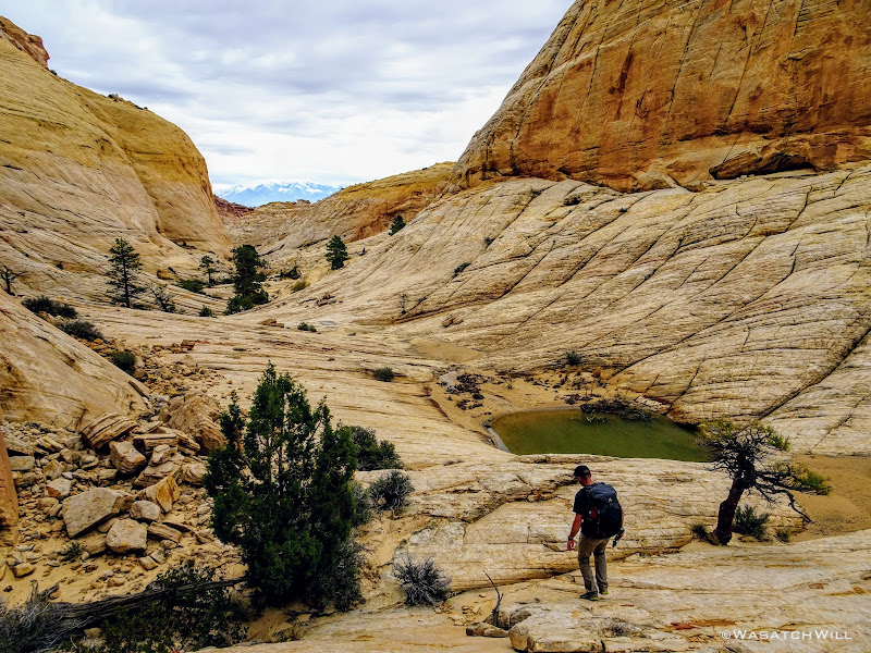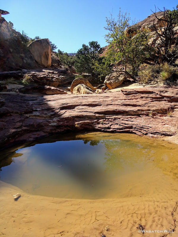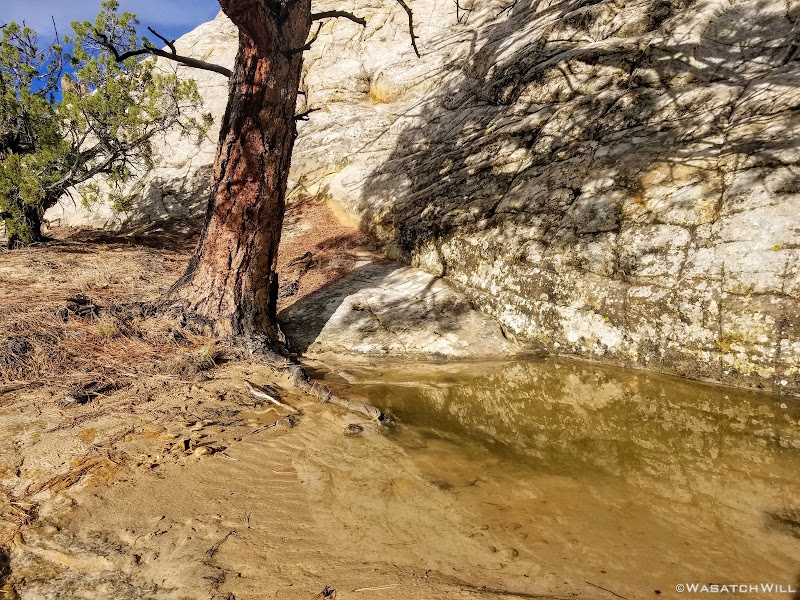 Once around the backside of The Spire, we had to find another ramp or gulley that could lead us off the ledge down into a wash. We ended up in a gulley with a lot of bushwhacking. Once in the wash and rounding a bend, we encountered something we fully expected to encounter many more of, a small pool of water. In recent weeks, the area had actually taken on an early snow storm along with some significant rains. Knowing this virtually assured us that water sources would be abundant all along our route. Did I mention this trip felt like catching lightning in a bottle?