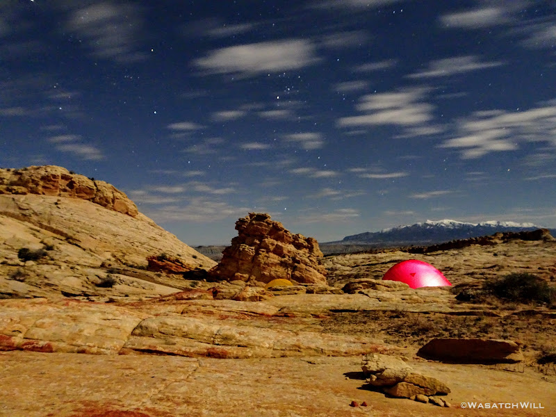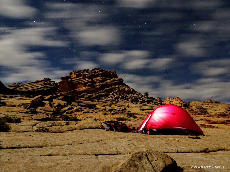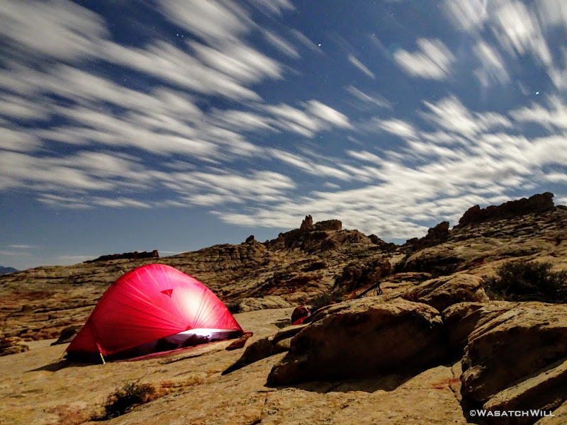 I got out of my tent to tend to a nature call, a late night dessert in the form of a snickers bar, and then just take in the ambient glow surrounding me courtesy of the moon as it illuminated the passing clouds and the surrounding landscape.