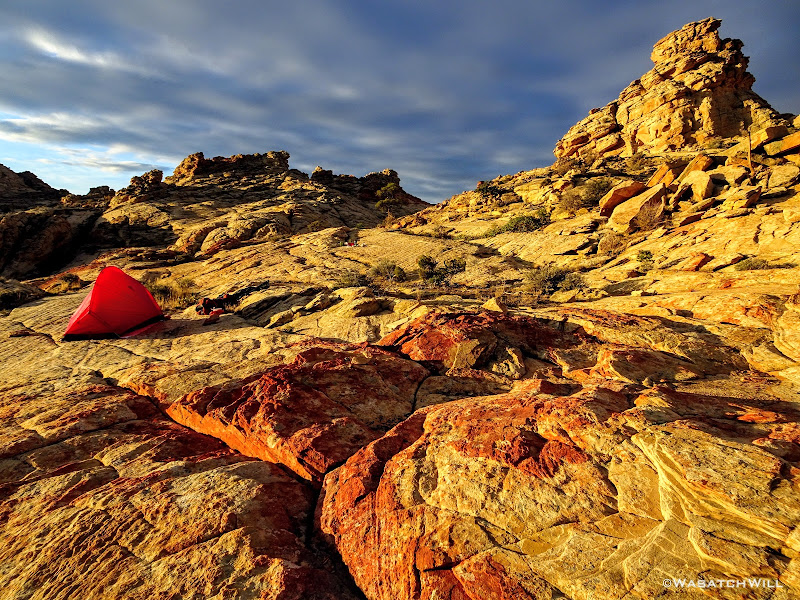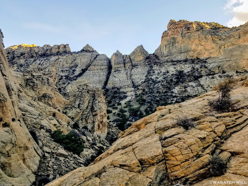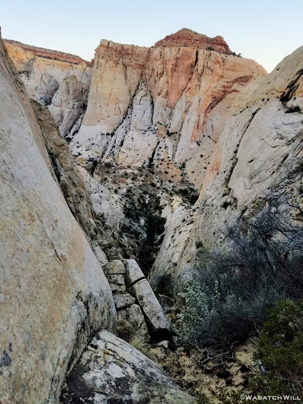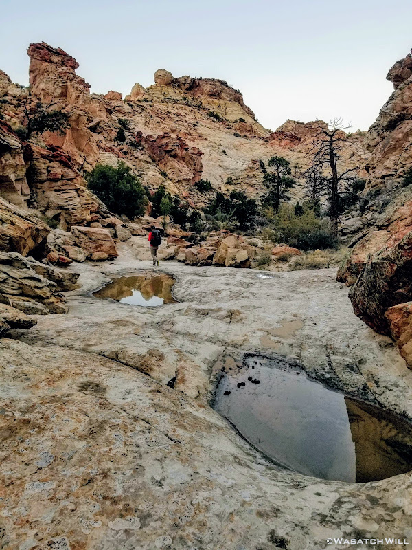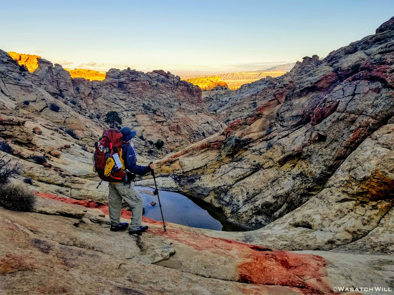 About a half mile further down the wash, we had yet another ridge to crest over into the next canyon. Realizing that finishing out the final mile we had planned for, which included yet another bit of a climb to bypass a narrow slot section featuring another series of pour-offs, would probably result in some hiking in the dark and most certainly setting up camp in the dark, we opted to call it good right there at the top of the ridge we were on and make up the additional mile the next day. Thankfully, between the two of us, we had an adequate water supply to make a dry camp doable.