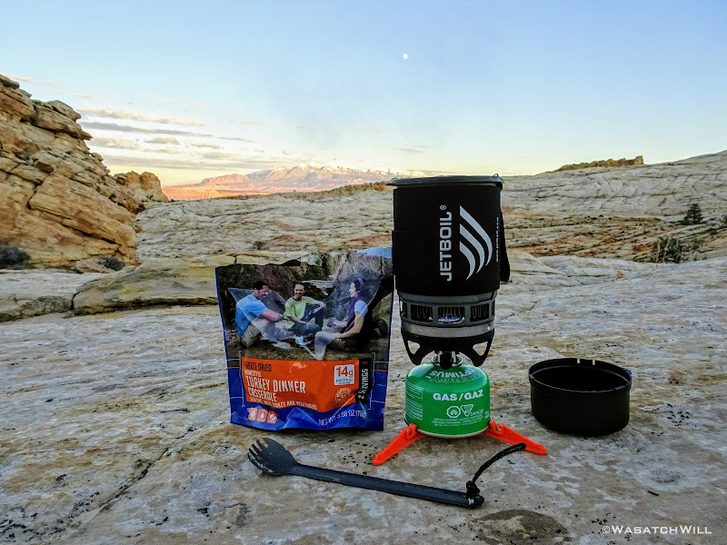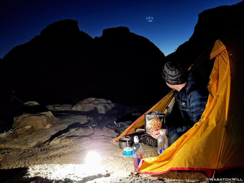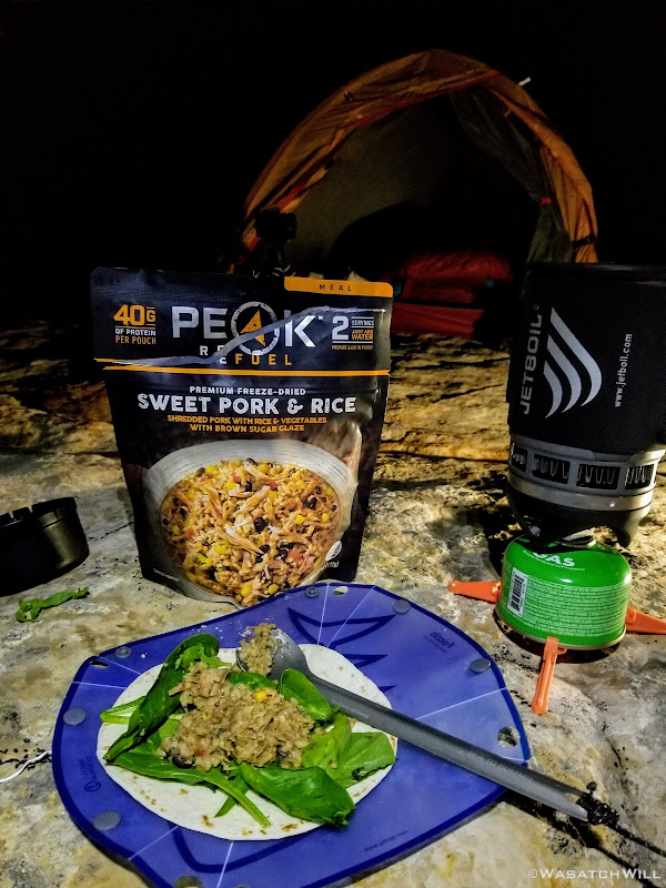 Moments later, we were enveloped by darkness. Dinner featured a new meal for me in the backcountry. Peak Refuel's Sweet Pork and Rice, along with some tortillas and some fresh spinach I had packed along all made for some fine wraps. This was my first time eating a meal by Peak Refuel, and it was quite good.