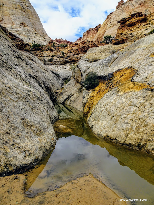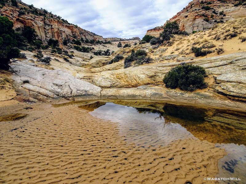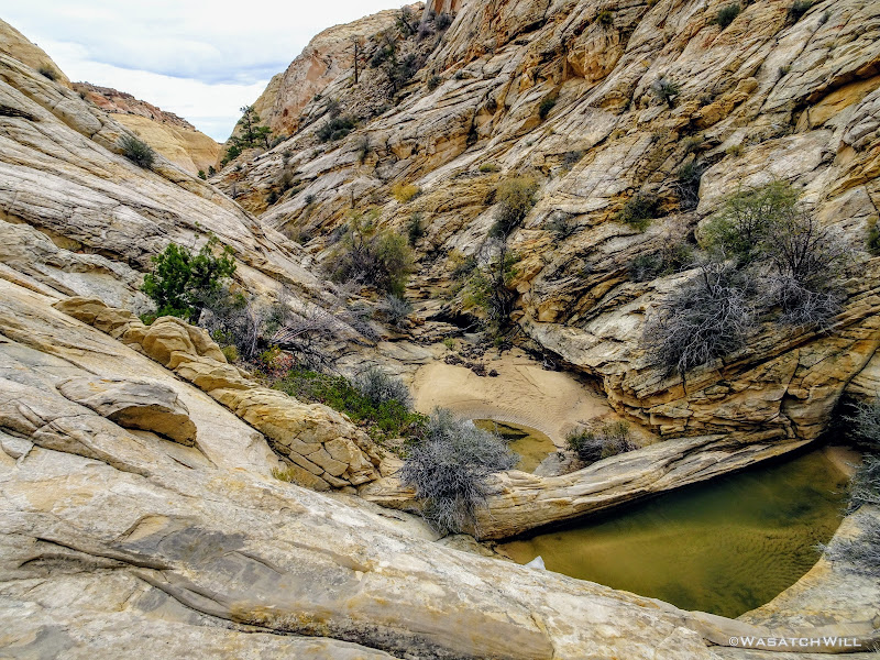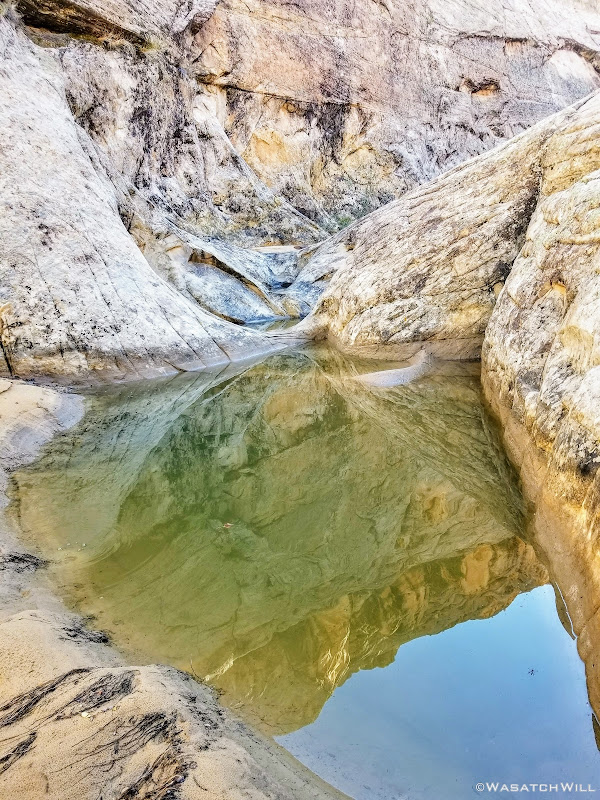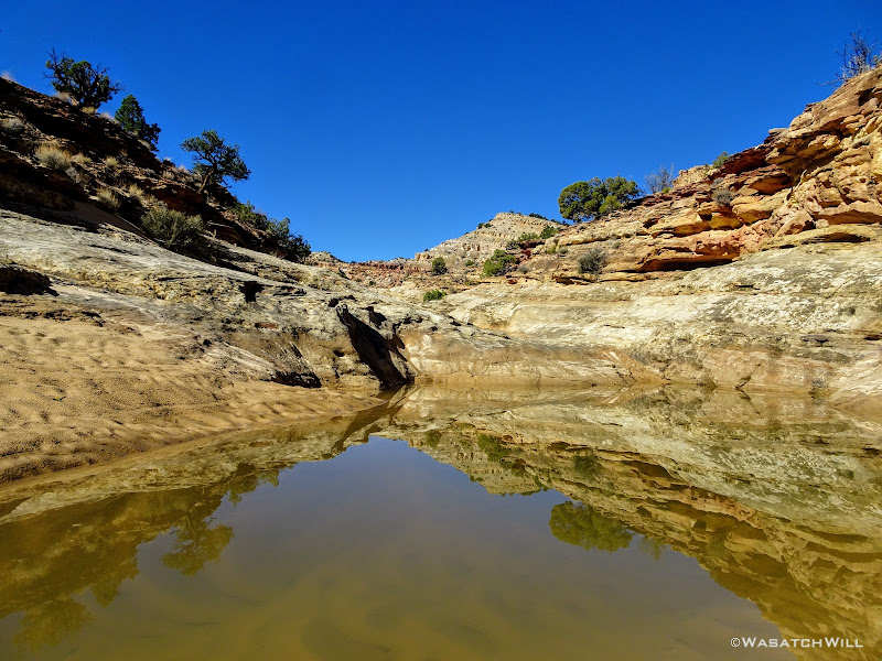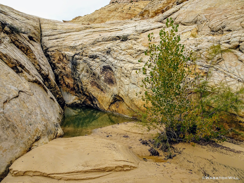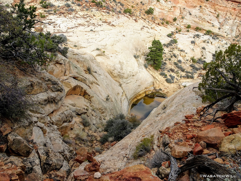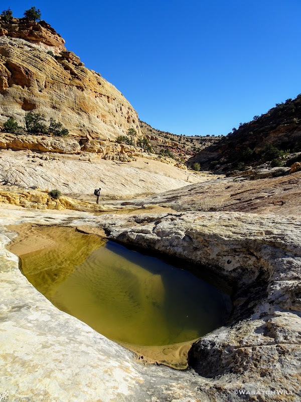 With packs back on, we now just had to descend the canyon I had camped in on my previous trip through these parts to reach the banks of Pleasant Creek. Pools and potholes full of water were ever plentiful down through this drainage.