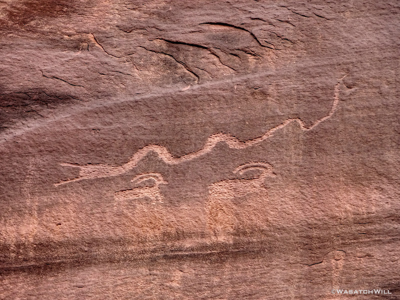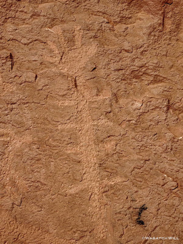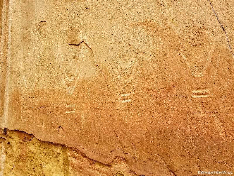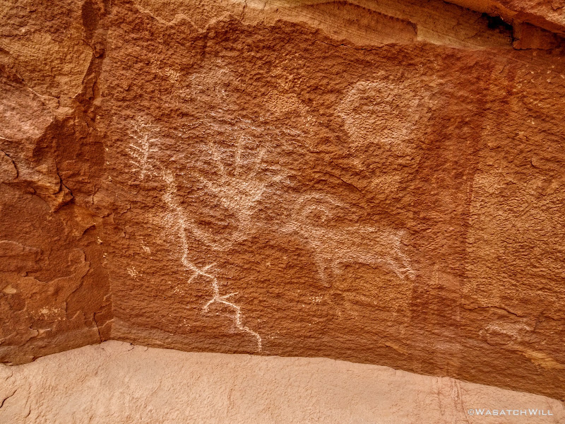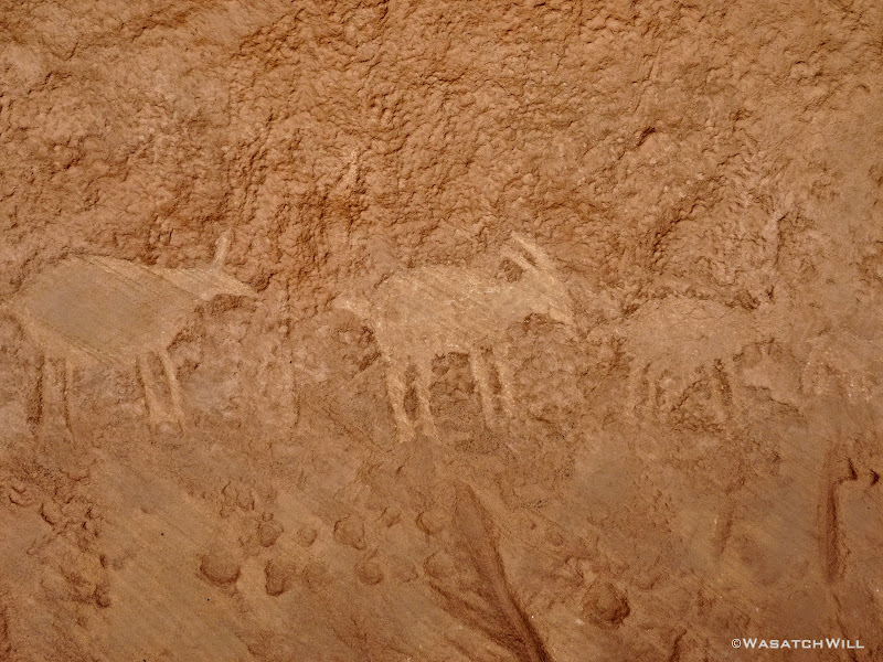 One spot has glyphs that puzzled me the first time I found them for they certainly weren't like all the other Fremont figures elsewhere along the wall. I now see them as more likely to be what I would call cowboy glyphs, probably carved by some rancher or pioneer of the more recent past.
