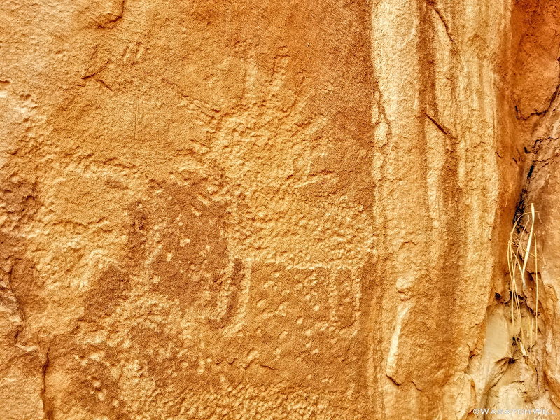 After making our final creek crossing, I led Devin up to a wall near the mouth of the canyon where a quite a few more different rock art panels can be found.