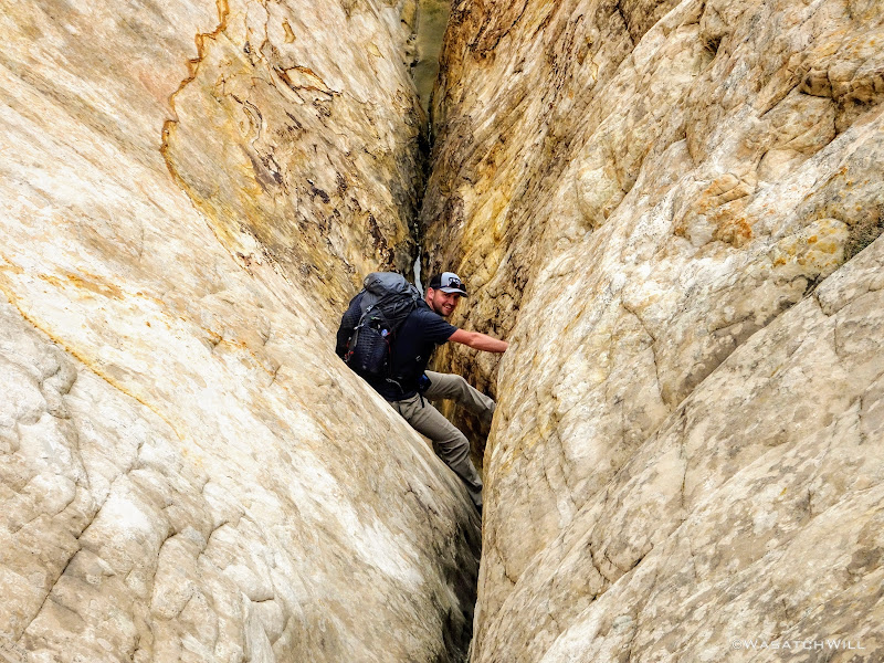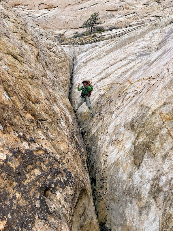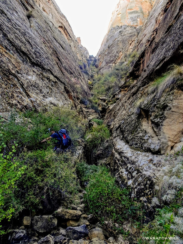 Devin remained surprisingly nimble as he moved along the canyon wall toward the top of the gulley we were targeting. Seeing how shaken I was, he made himself a saint by completing the challenging traverse, dropping his pack, then coming back to take mine. After the brief rest and without the burden of my own pack, I was able to finish the traverse with my legs feeling much more stable again.