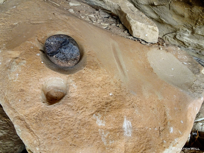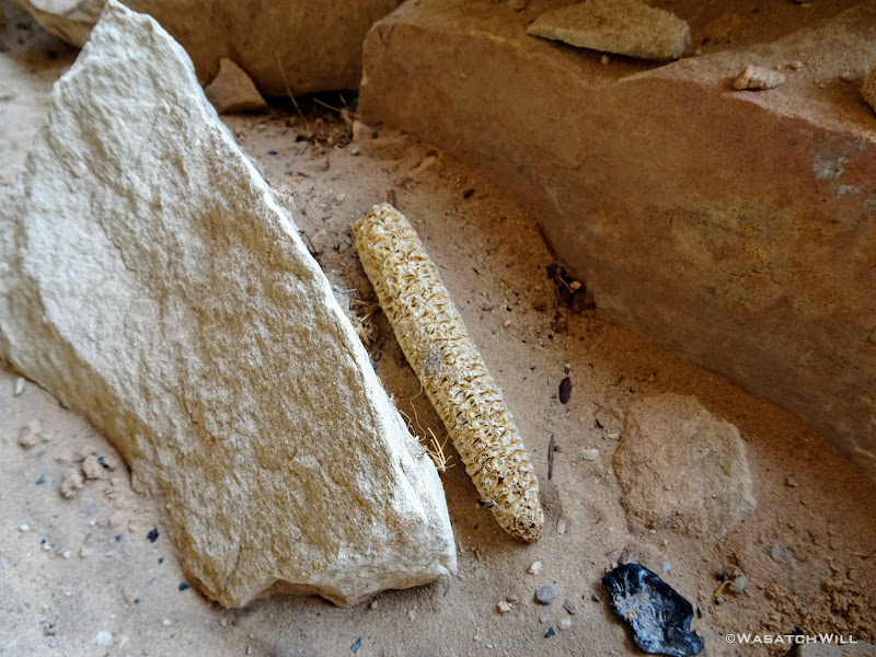 Up in the canyon, we pulled over for another break so I could show off a cozy little archeological spot with a nice view down onto the creek. Behind the rock we perched ourselves on for lunch were a couple of small cave-like cavities coated with soot in the cliff side, a mano and matate, a maize cob, and a couple petroglyphs. Having brought my daughter Ellory down to this point as part of our trip in June, it was my 2nd time here this year.