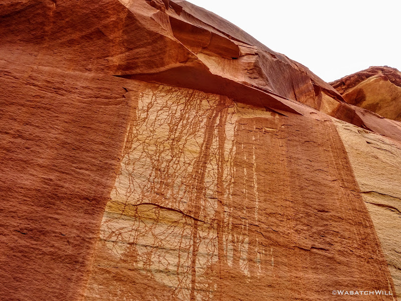 Here, we could have made a great camp, but we opted to keep moving along through the upper end of another little canyon to the south. I'm keen to call it "Checkerboard Canyon" because of the far side that is textured like a grid. In the Capitol Reef episode of Rock the Park that airs on ABC each week, hosts Jack and Colton slept here on their night out in the Capitol Reef backcountry. It was obvious they had gotten their route from Steve as well.