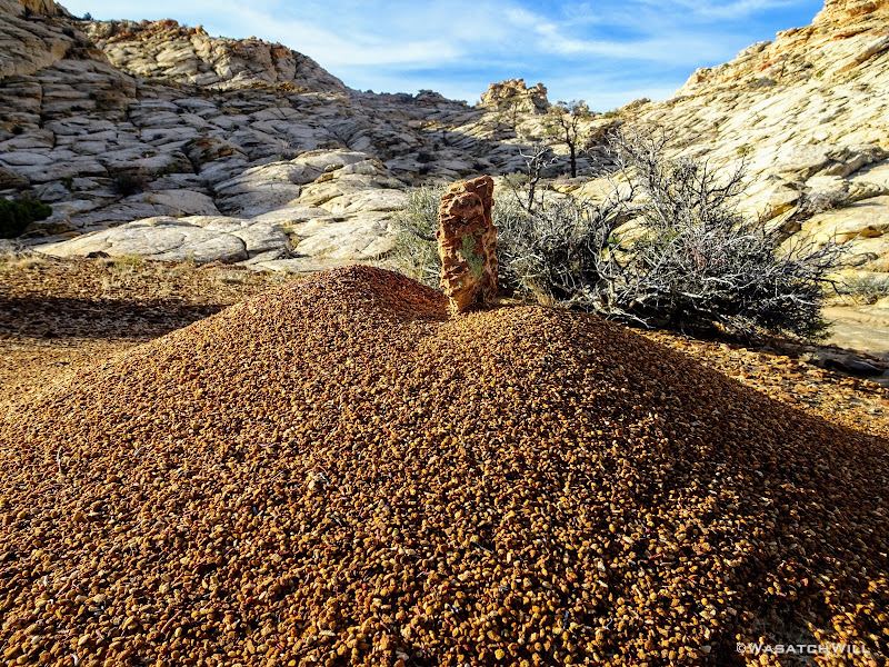 We did our morning rituals, broke camp, and set off for Pleasant Creek. Along our way out, the clouds dispersed for a bit allowing us to enjoy a bit of bluebird sky once more. Moving along, we noticed what looked like a typical large ant hill in the desert. What made us scratch our heads was how a rock became perched upright within the crater.