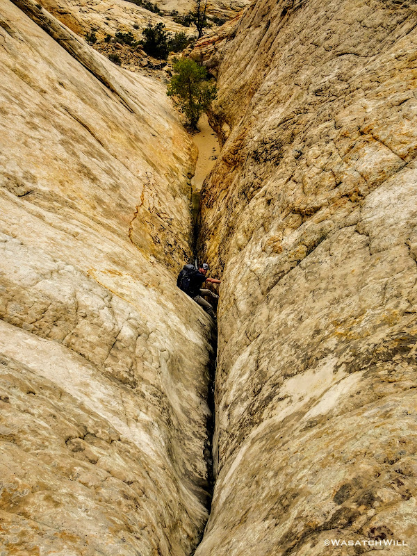 As we coursed our way down the wash, we ultimately hit what may well have been the most challenging obstacle for me of the entire trip. A pour-off that we anticipated having to bypass with some careful footing along the steep walls of the canyon.