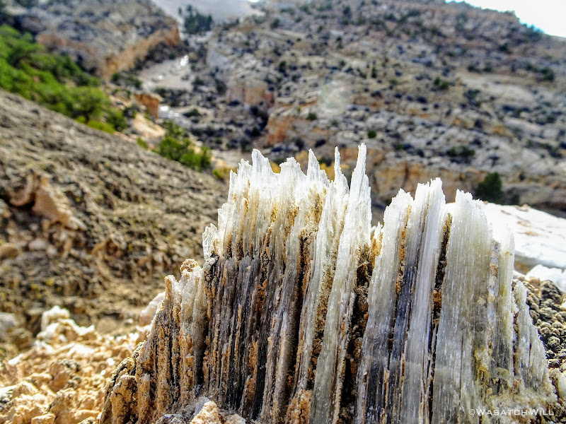 As nice as it could have been to linger a little longer, we were more eager to move along to the area where we'd seek out another worthy campsite. Along the way, I noticed a few small uprisings just off our route among the cryptobiotic soil we were passing by and around. I believe it was some Gypsum.