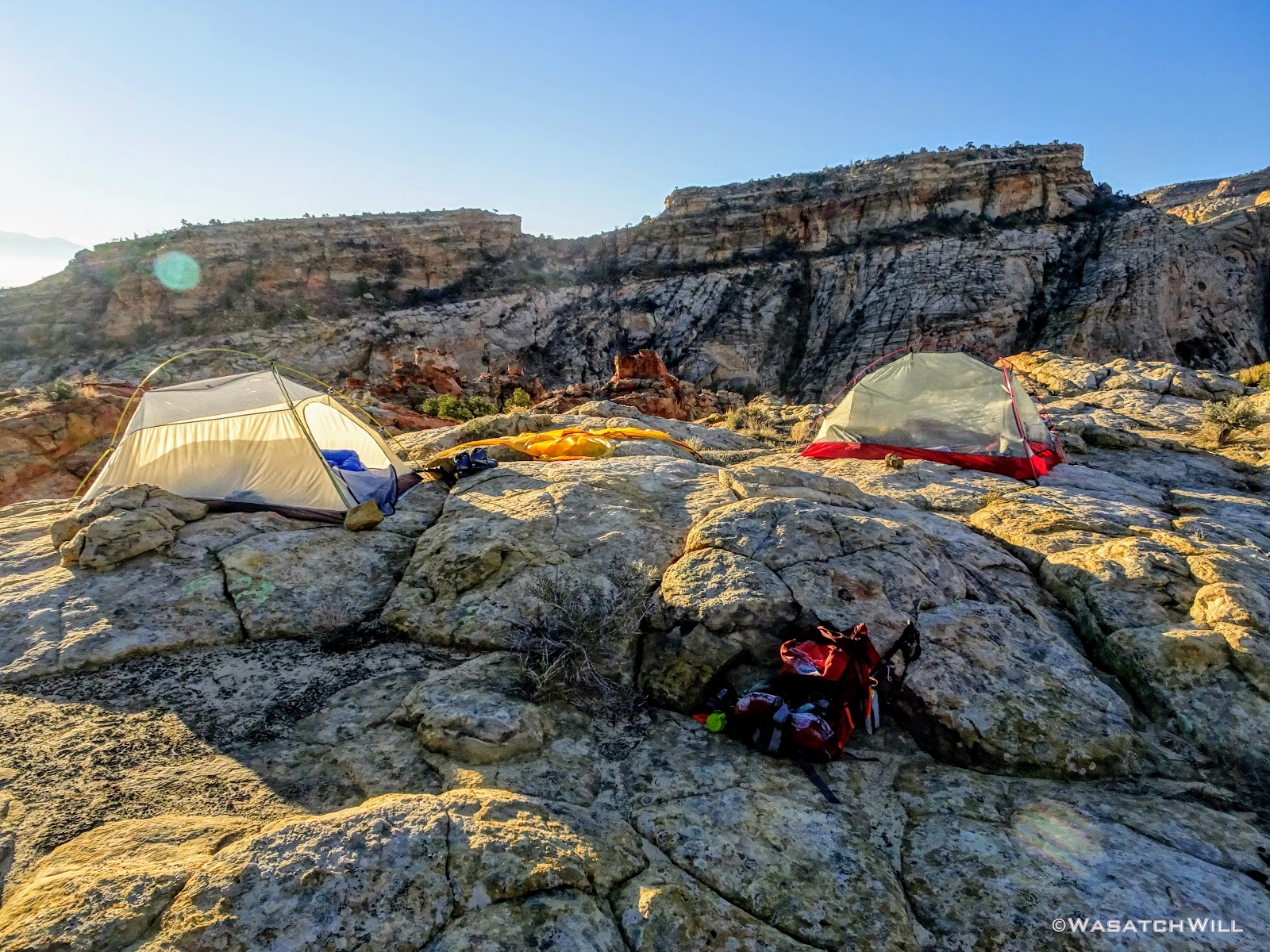 About a half mile further down the wash, we had yet another ridge to crest over into the next canyon. Realizing that finishing out the final mile we had planned for, which included yet another bit of a climb to bypass a narrow slot section featuring another series of pour-offs, would probably result in some hiking in the dark and most certainly setting up camp in the dark, we opted to call it good right there at the top of the ridge we were on and make up the additional mile the next day. Thankfully, between the two of us, we had an adequate water supply to make a dry camp doable.