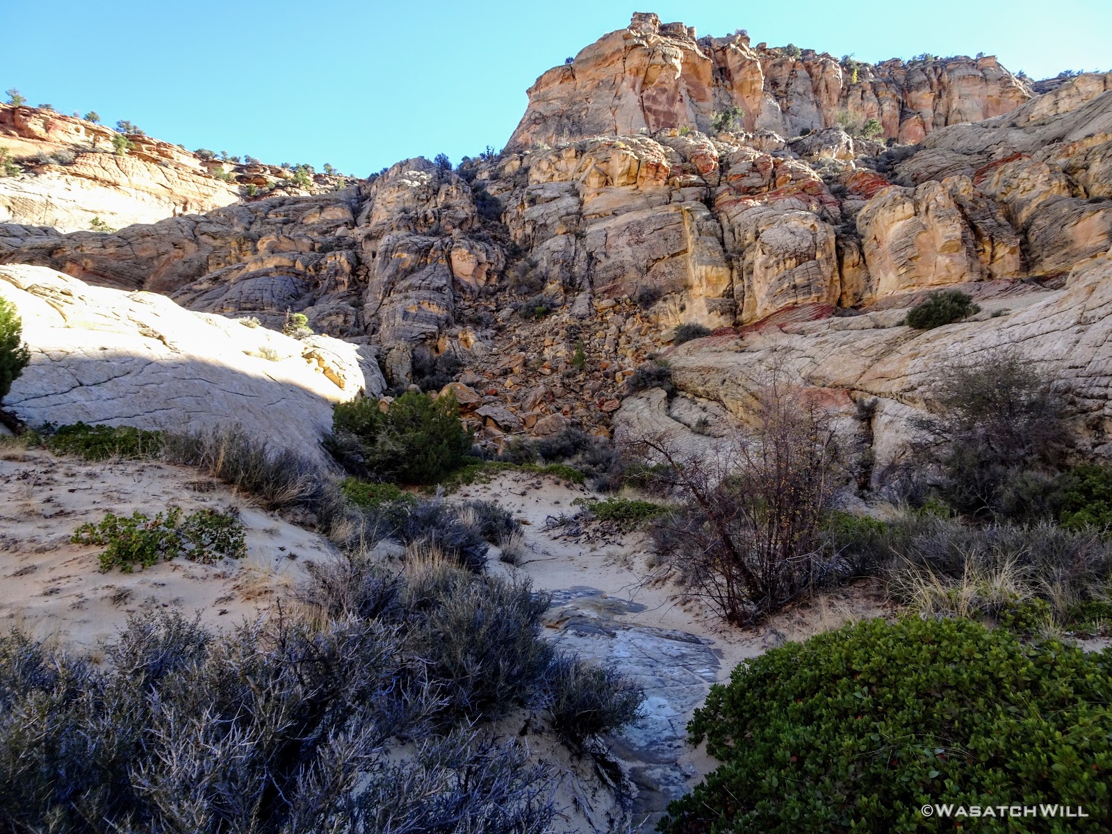 With packs back on, we now just had to descend the canyon I had camped in on my previous trip through these parts to reach the banks of Pleasant Creek. Pools and potholes full of water were ever plentiful down through this drainage.