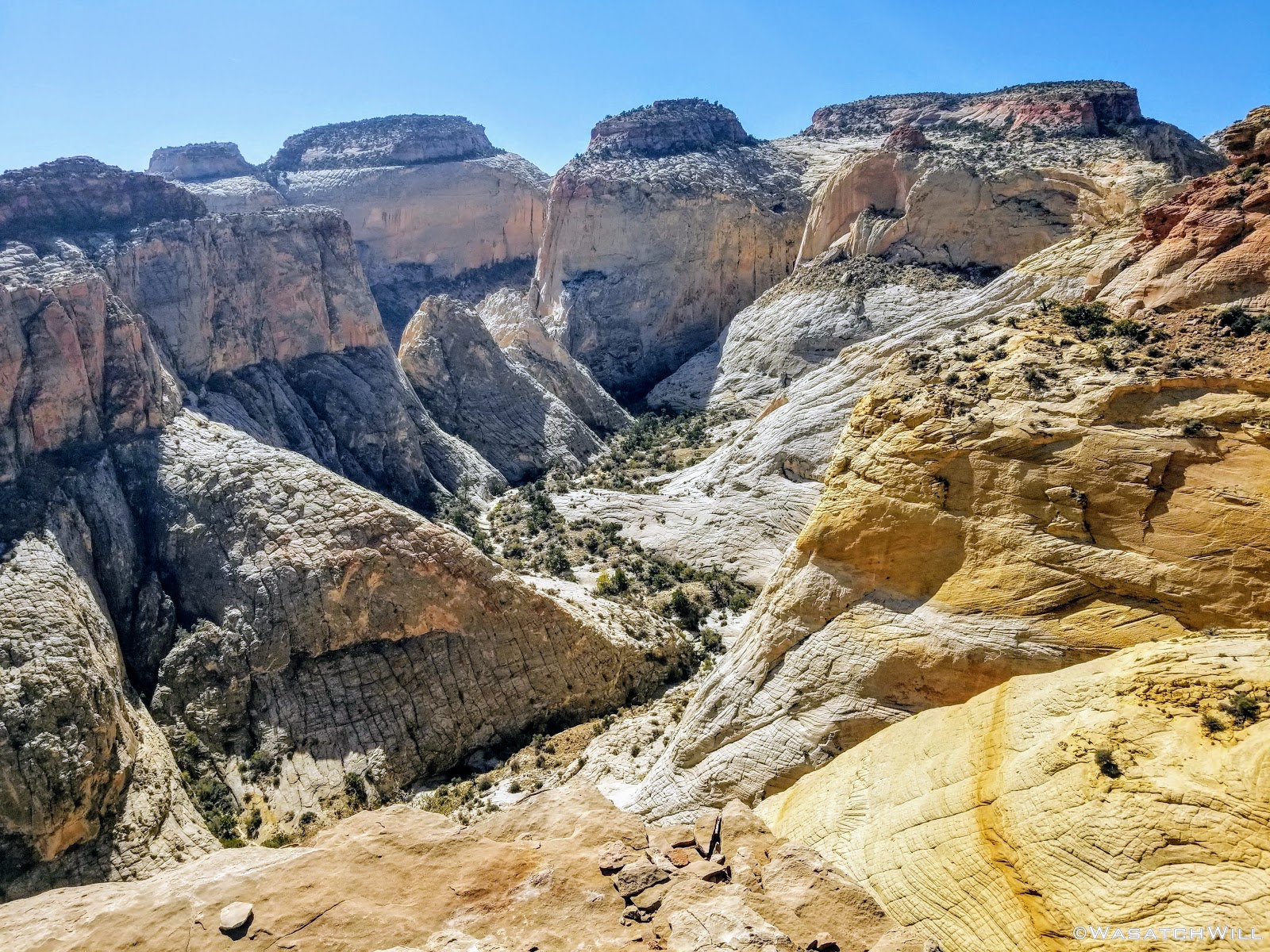 Soon after, we left the low lying Capitol Wash in pursuit of higher ground once again. This time being a 2.5 mile slog to gain 1100 feet. I knew what to brace myself for but this particular afternoon was more of a mental challenge on Devin than any other part of the trip. It wasn't very strenuous and certainly no major obstacles. It was just long and hot with little change in the terrain and scenery until the end. But...then, we finally hit a rim with yet another amazing overlook allowing us to see across the canyons we had just cut through that morning. It was another nice, hard-earned reward that served to recharge our spirits, every bit as breathtaking as I remembered it from the year before.