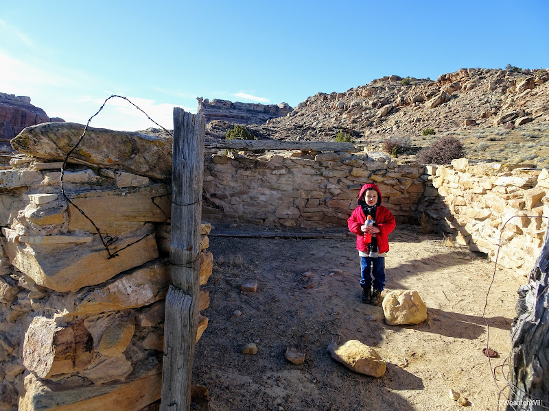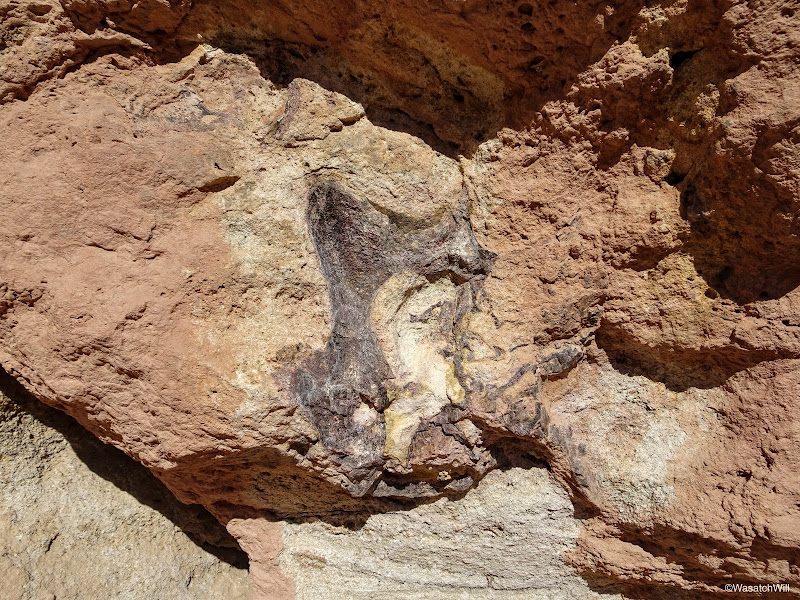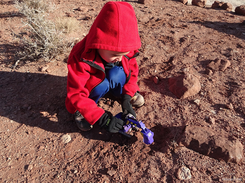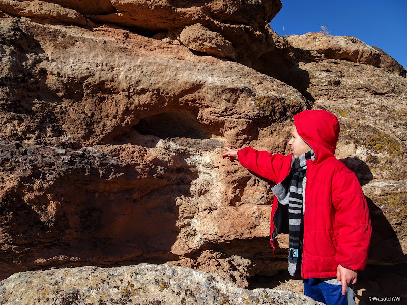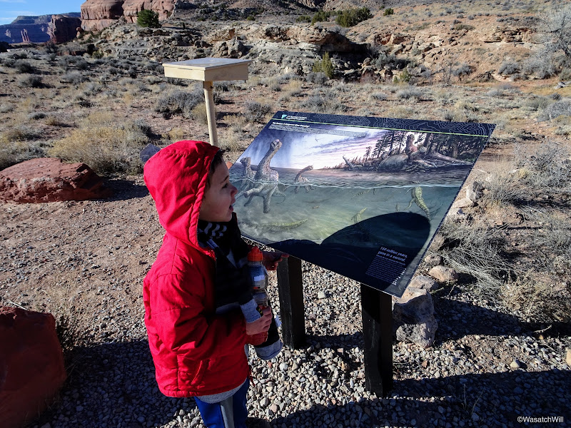After a quick stop at Halfway Station, we carried on over to the Mill Canyon Dinosaur Trail where it makes a short loop passing by a number of fossilized dinosaur bones embedded and exposed in some rocks at the mouth of Mill Canyon. We had actually come here with the rest of the family during a past spring break trip a few years before, but I don't think Lennox was old enough to even walk well then so he certainly had no memory of it. It was as good as new to him.