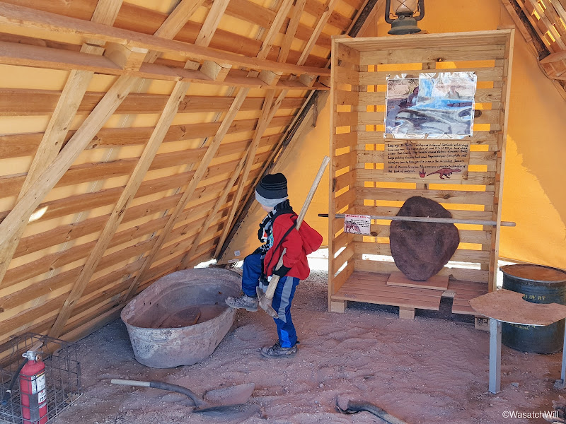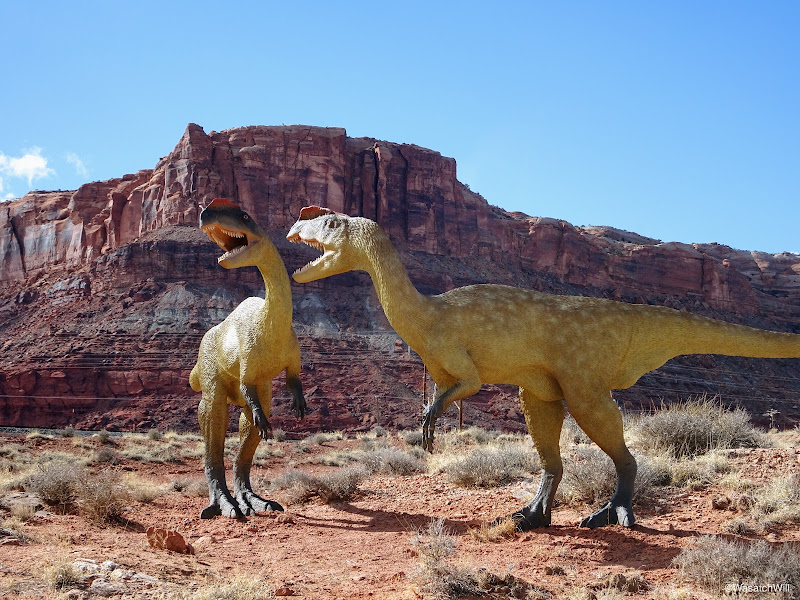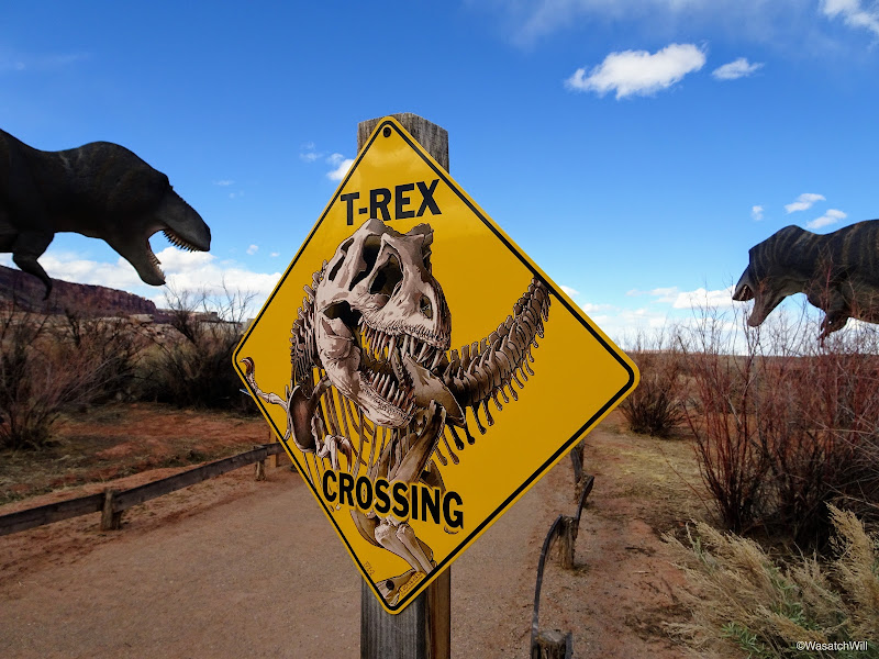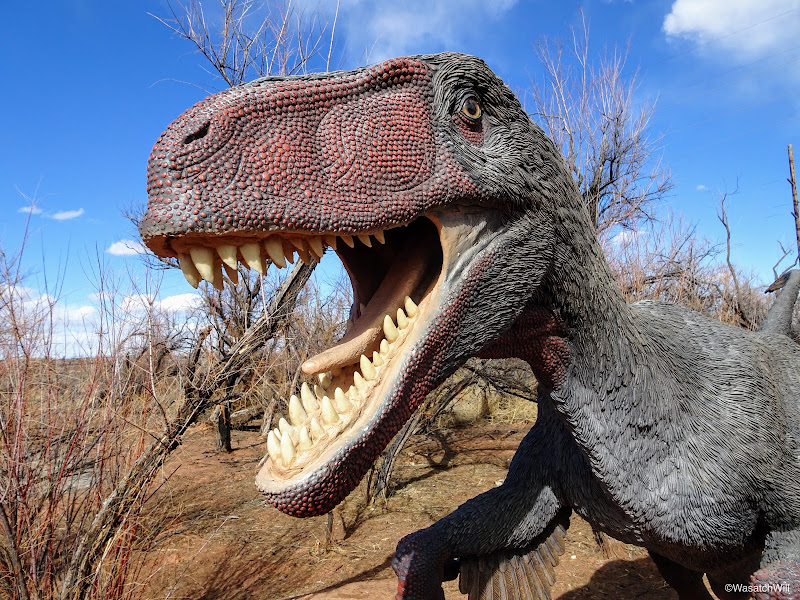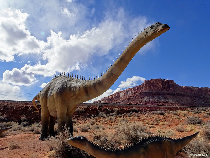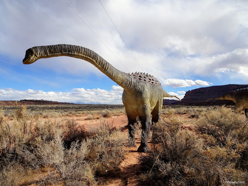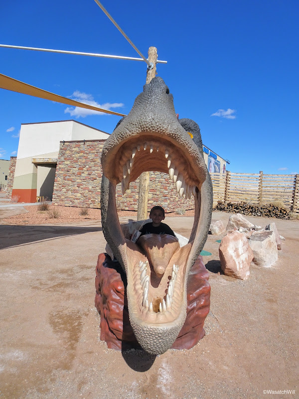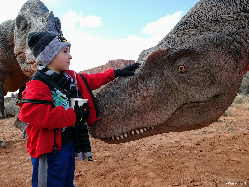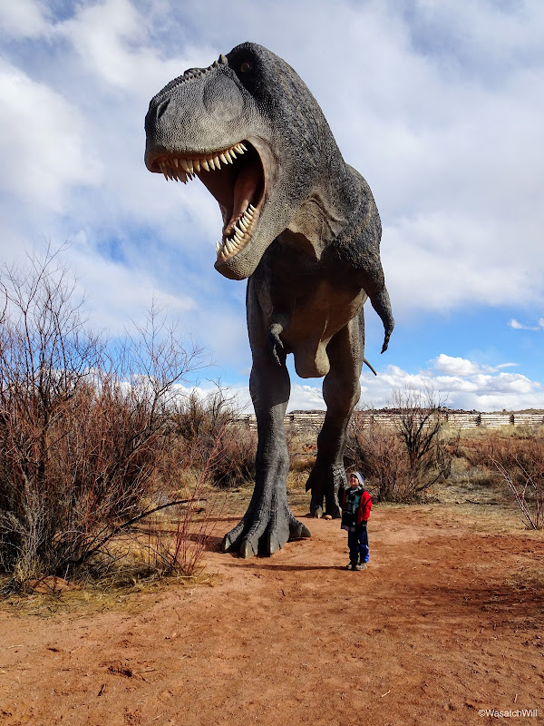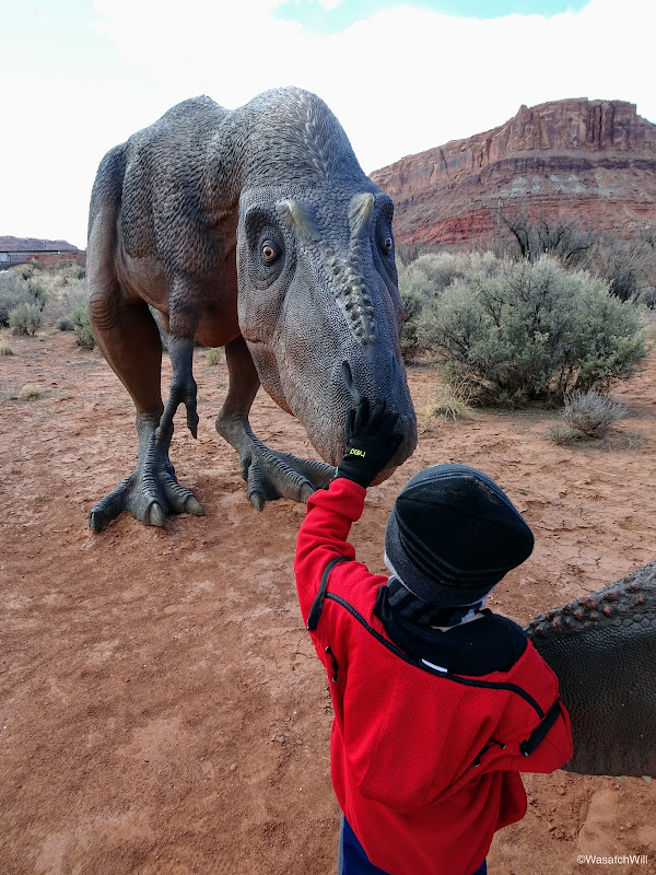 From Tusher Tunnel, we made our way back out to the highway and followed it for a few miles to the relatively new Moab Giants Dinosaur Park and Museum for a break from our backcountry-ish adventures. It charges quite a bit for admission which would make it pretty expensive for a large family, but since it was just the two of us on this trip, I splurged for us to have some educational fun there. We had lunch at their cafe and then made some good memories exploring all the outdoor exhibits before moving on with all the technology enhanced indoor exhibits. I took plenty of pictures outdoors but didn't bother to take many photos of anything indoors, mostly because much of the features relied on 3D screens.