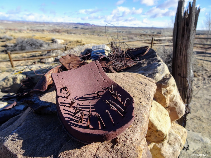 Halfway Station served as a rest stop for travelers halfway between Moab and the railroad station in the small community of Thompson to the north in the late 1800's into the early 1900's. There were a scattering for old relics at the structure, including some old shoe soles.