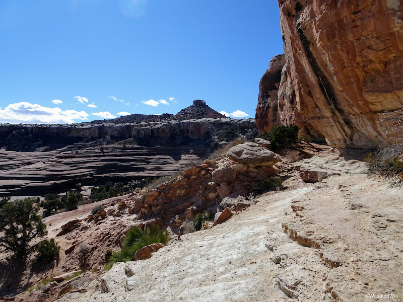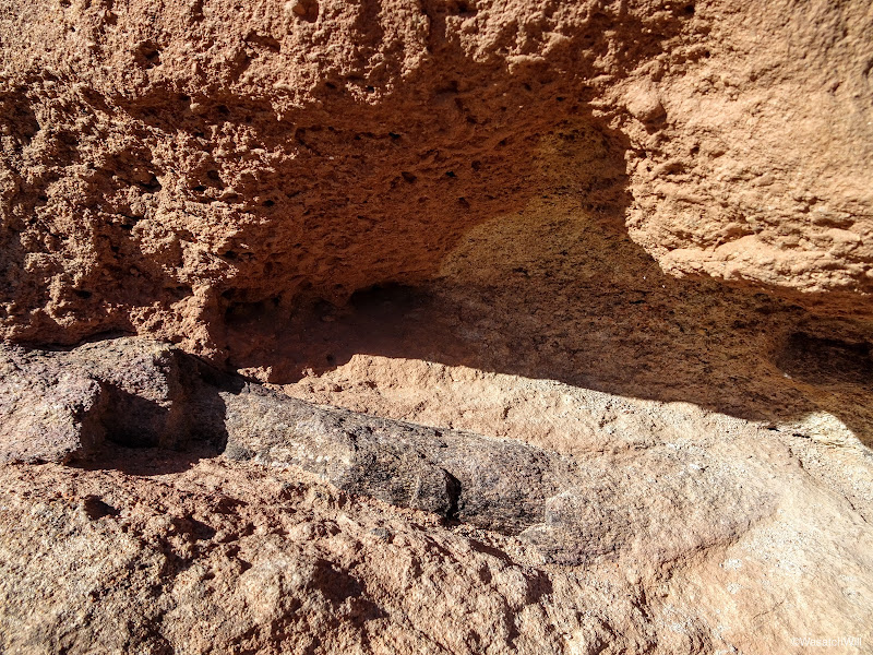 Just before dropping back down to the wash and closing out the loop, the trail passed by an impressive petrified log buried within the sandstone cliff.
