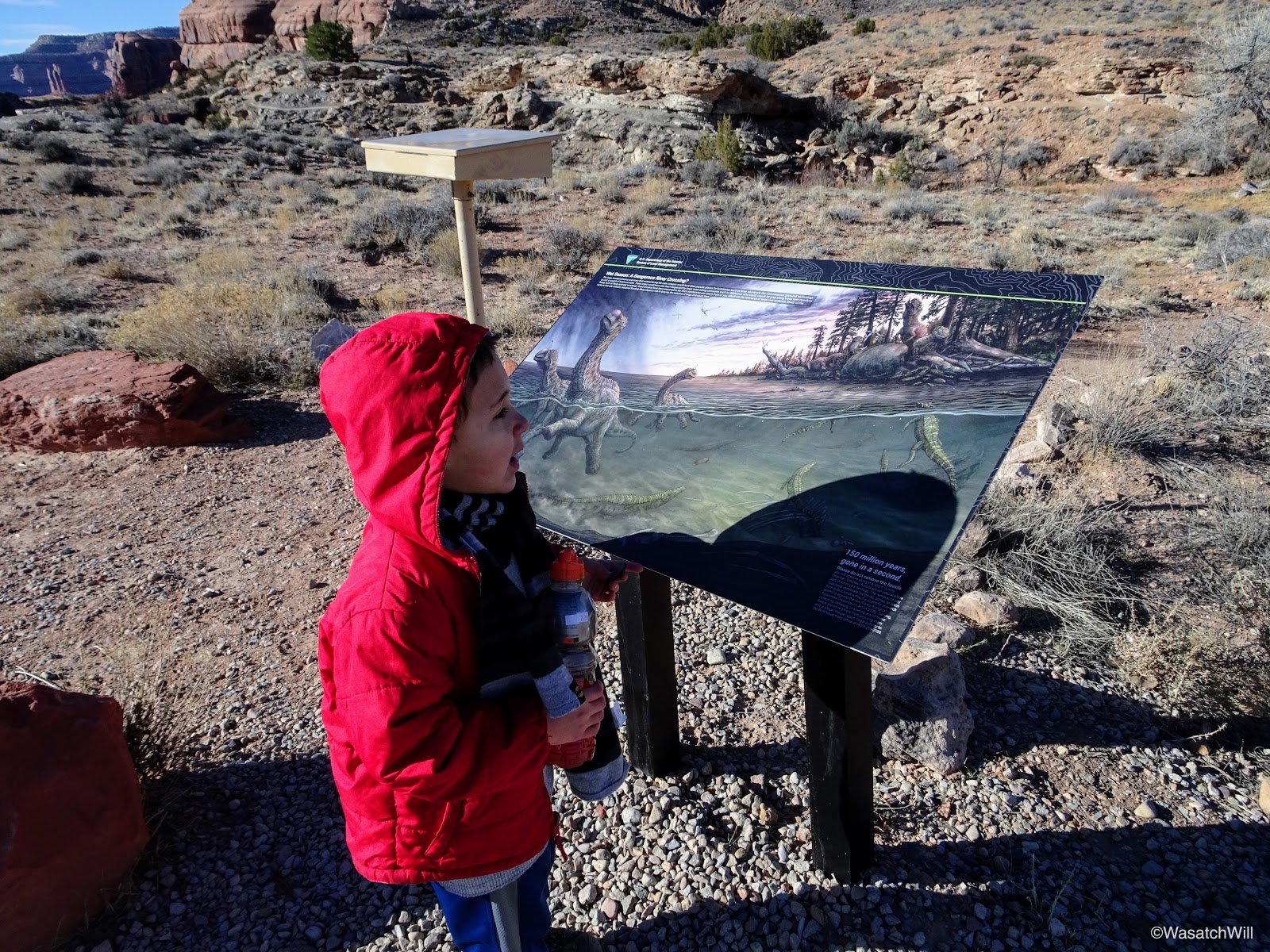 After taking his sisters out for a camping trip the prior month, it was now my son's turn for a camping trip. Since he loves dinosaurs so much, I took him down to the Moab area where we enjoyed a paleontology-themed trip, visiting some dinosaur fossil and track sites, a dinosaur museum and park, in addition to a few other points of interest in the area.