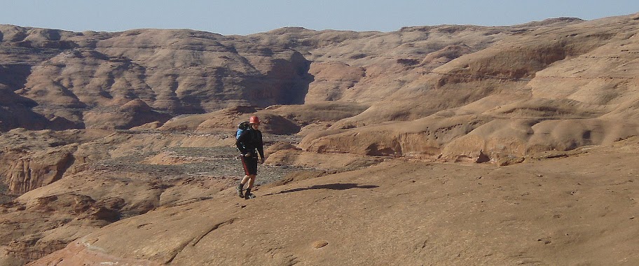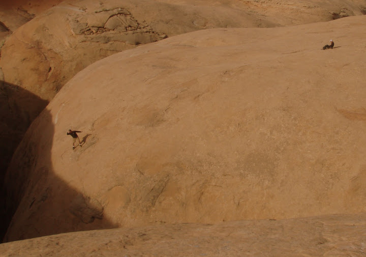 We are soon met by hard up moves again ... and again ... and again. I grab some fast calories. All the ledges, big and small, are coated in an inch or more of sand. An unusually large amount for such a place. Have to twist my toe a tad, clearing sand, to find the actual shape of the ledges. Aaron says we are near the spot where he went up to. The rim team says we are near the spot where Aaron got up to ... but it doesn’t come quickly enough, in the world of a quarter mile an hour.