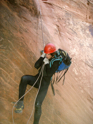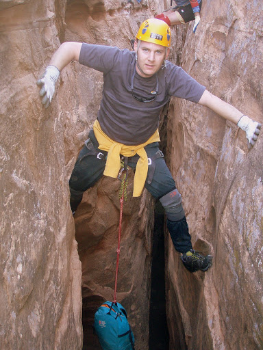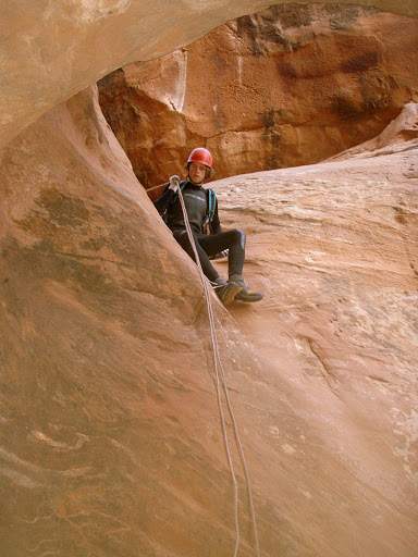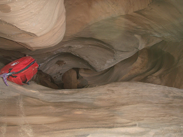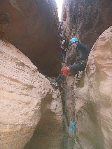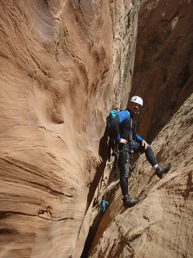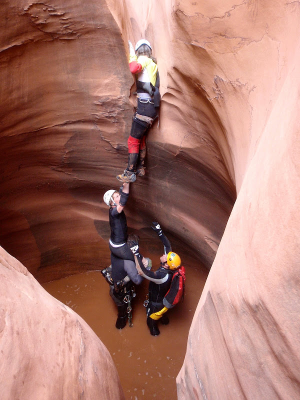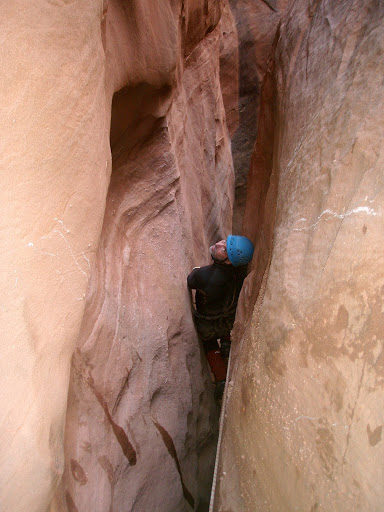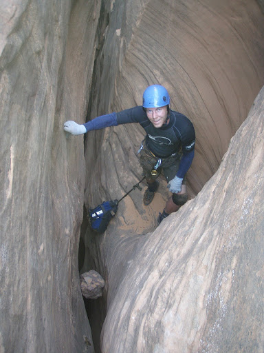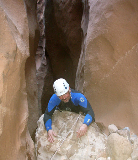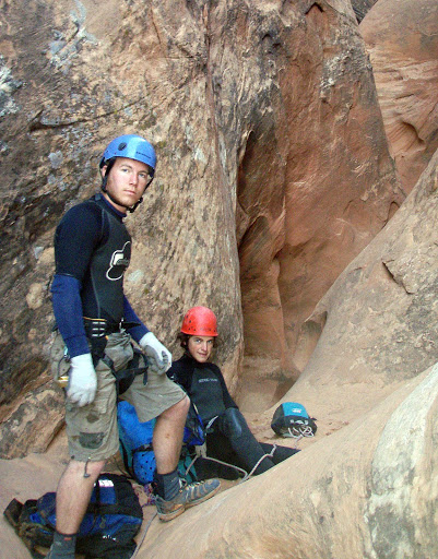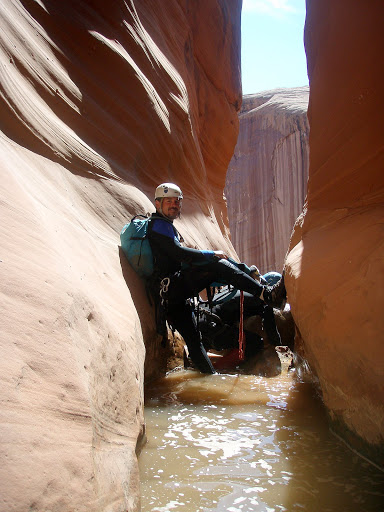 Thank you to the guys who sat rim and gave us a way out, Wyo Dave and Tom W. Landon was awesome in his first serious canyon. He gets to go whenever he wants to. And about Aaron: He carried the weight. He did the last–man–at–risk thing. He scouted the place the day before. He tackled the worst silo first. He offered the calming voice and reassurance. I knew it was coming. I worked and planned for it. It has arrived. I pass the torch. I now follow and am sucked along by his considerable skill. May I be fortunate enough to ride that wave for at least as long as he rode that same wave behind me.