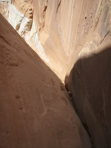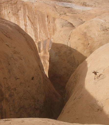 I am relieved to be lower in the canyon now. Not so much big air. That does not last long. Ahead of me is a long exposed silo. The drop is 30 feet, but it is a bottom fall, for sure, if one were to err. The geometry of the place is like none I have ever seen before. It is a long rectangular room. If one were to drop in there, I can’t see how one would ever get out. Jail with no need for a jailer. A true mouse in the bucket, complete with walls too far apart to stem and a roof covering the ends of the room. Only the gaping hole in the middle invites one in for a view. To cross the top of it is quite wide. The walls are made of sugar and it seems to get wider. I feel a panic take hold. I back off without even looking past the bulge and let Aaron go look, as I cower in the corner.