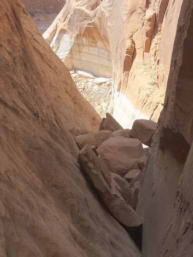 It takes quite a while, but the boys return. The upclimb he feared, was in fact hard 5.10 and he was thrilled to have a belay. He reports wonders from the lower part of the canyon. Aaron claims to have descended nearly to the end. I am skeptical. This youth can stretch a tale a bit. But after we jug out, with me taking forever to get the system working, I gaze at the images on the camera. By jolly, he did get far! The canyon totally changes character, dropping down a steep gully/groove and does so in a grand setting. He made awesome time covering this easier and fast dropping section. Stopped by a drop of 15 feet, impossible to reverse, he describes a turn in the canyon that I have seen from below the final 20–foot drop, 4 years ago, on another trip.