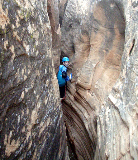 Ah but we have appointments to keep. We head over toward the break in the middle of Pottymouth, where we meet Tom and Landon waiting for us. You see, one needs to go down to near the end, inside Pottymouth and set a drop, for one to return, after one finishes Snotnose, ah ... I mean Sinusitis. Your exit back to the land of the living is up lower Pottymouth. We could skip the next section of Potty ... but are we not canyoneers? Besides, the canyon is a delight. Physical, off–the–deck work, with the occasional wade and fluted drop. All are enjoying this very easy R- rated canyon. Soon we reach the end of the middle section, drop gear and head down to set the rope to make our exit possible from the neighboring canyon, Sinusitis.