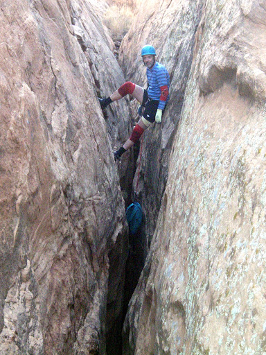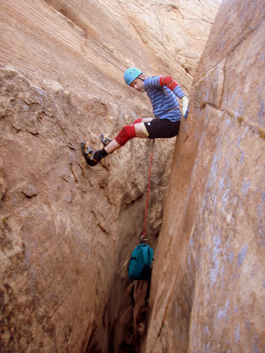 We talk about how we can protect this place and we come up empty. Aaron sighs, eyes the thing and then is across. Hip on the left wall and rotated down, right foot doing the tip toe dance on the right wall. Gulp. Damn, damn. Landon starts over. I close on him...and move just a foot or so behind him. His proximity gives me courage. And in 10 seconds it is passed. They stop to gather themselves and reflect. Not me!! I must regain the nerve I have lost, by ‘doing’ again. I flash up to the front. Nice, huh? Lead until it is hard, then get the kids to go first! Then grab the lead back.