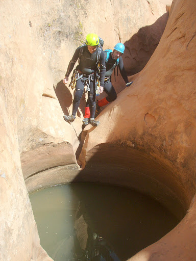 We get down to the canyon and decide rim logistics: left rim early, around the top, and right rim better down lower. Almost time to go. I mention that another great canyon is nearby, unexplored, to our knowledge. Potholes, then a big drop ... or so we surmise. Only 5 minutes away. All are interested, but someone accuses me of stalling. They are right, of course. After this short diversion, we all do the first drop, downclimbing on belay. A pothole is hard to exit, but after fooling around with the ‘how’ a bit, it succumbs to an arm jam. The canyon is pretty easy for a hundred yards ... then the bottom drops out!