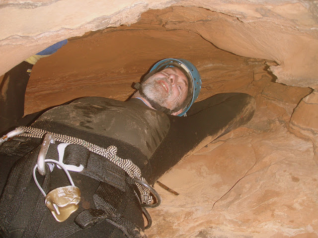 Up above, we chat occasionally with Dave and Tom. We even get the occasional line of sight on them. What a comfort to know they are there and listening to our every word. I have sat rim. It can be like watching paint dry, but when you can hear ... then it is quite interesting. Another drop looms ahead. A pattern has been established. Hard upclimbs, often body squirming wars, force you to fight up to where you can stretch out a tad. Then you cruise for 5 minutes. Maybe 10. Then you are forced down. Cross part way down by stemming a little while ... then you face another hard up. Repeat drill. I consider. So much hard up? I conserve energy where I can. More back and feet, less galumping. I arrive at the drop. Likely an easy elevator, it swings underneath, blocking me from a good look. I take an ‘in canyon’ belay again. This one is easy and my pals quickly follow.