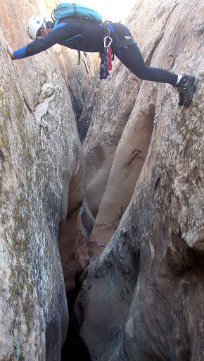 Thank you to the guys who sat rim and gave us a way out, Wyo Dave and Tom W. Landon was awesome in his first serious canyon. He gets to go whenever he wants to. And about Aaron: He carried the weight. He did the last–man–at–risk thing. He scouted the place the day before. He tackled the worst silo first. He offered the calming voice and reassurance. I knew it was coming. I worked and planned for it. It has arrived. I pass the torch. I now follow and am sucked along by his considerable skill. May I be fortunate enough to ride that wave for at least as long as he rode that same wave behind me.