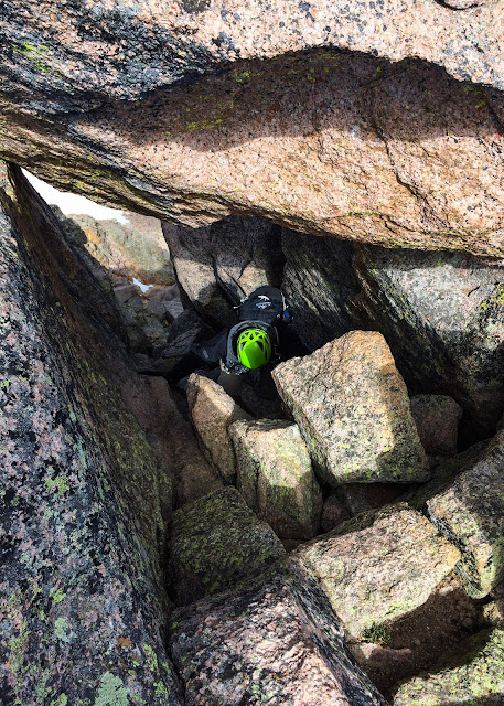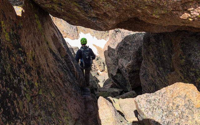 Scrambling up through a "hole" in the ridge; there are two holes along the ridgeline high on Sunlight Peak, the first one you don't go through and is smaller; this one is larger and longer and you do go up it to advance to the next section of ridgeline. (Photo by Dave)