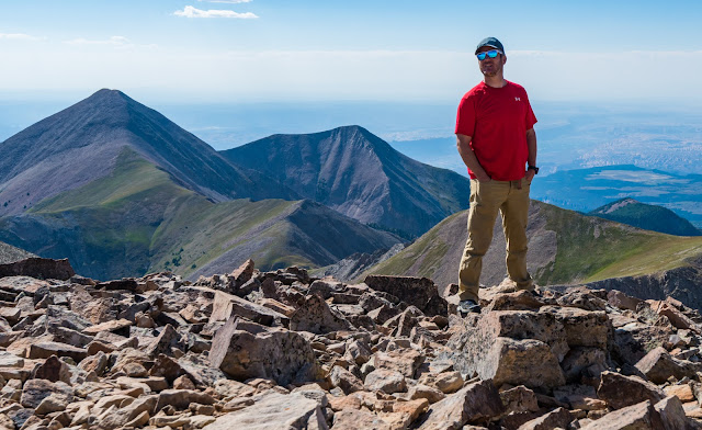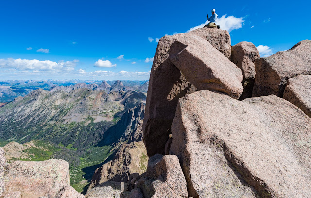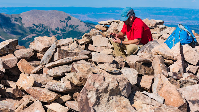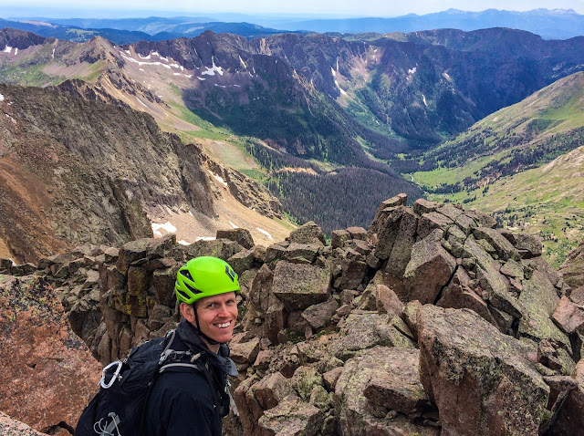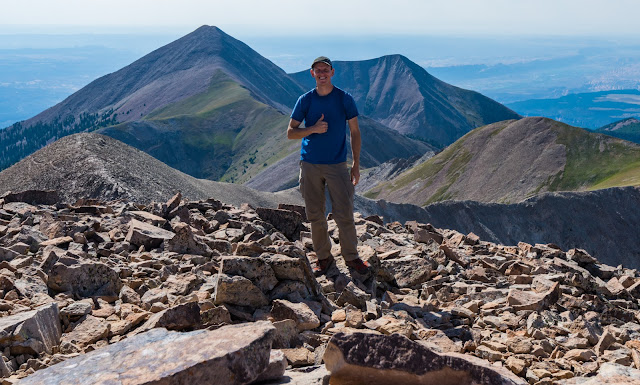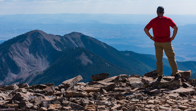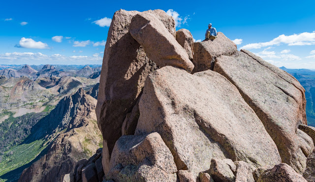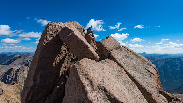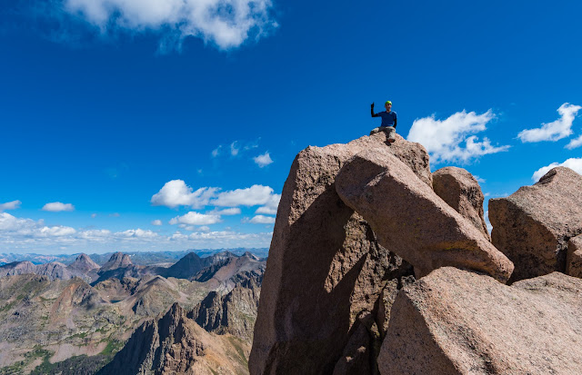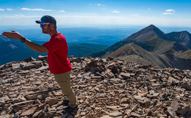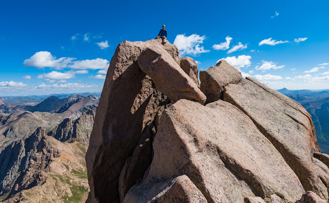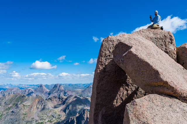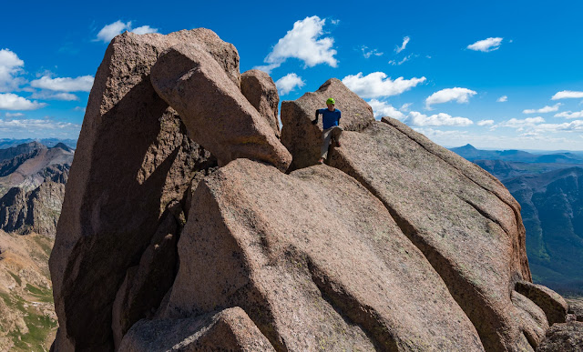 Dave on top of Sunlight Peak - hundreds of feet of open vertical space just a bit in front of him, immediately to his right, and behind him - this is, to this point, the most exposed summit I've ever been on. It blows the exposure on the summit of Utah's Wasatch Range's Lone Peak away...