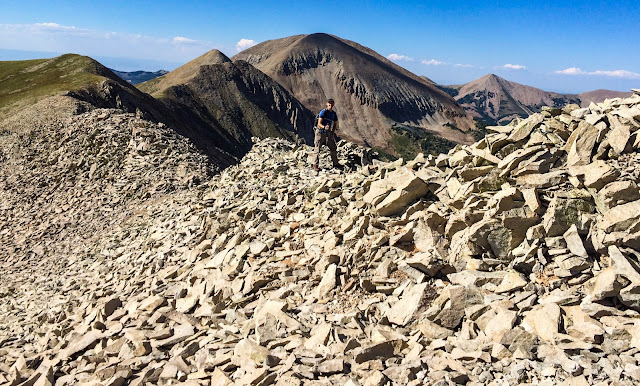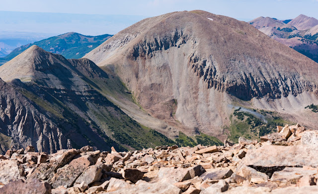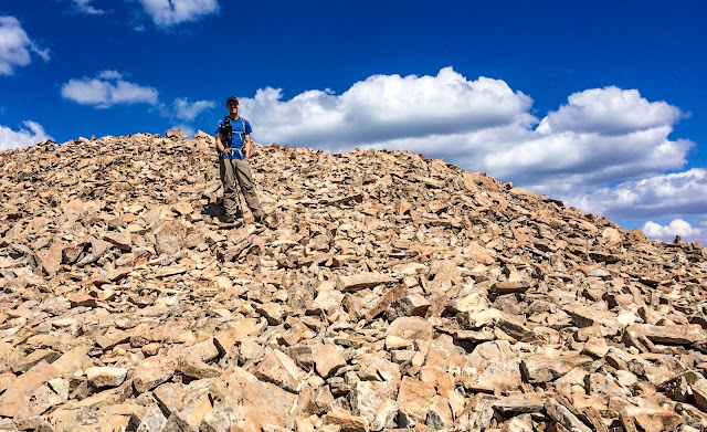 The upper reaches of Sunlight Peak (not all of what you have to traverse/scramble can be seen here in this view). Many of he blocks here are, generally, much larger than they appear. It was somewhere climbing up the left side of that steep massive blocky tower (top-center) that Dave, who was ahead of ,and above, me by about 10 - 15 feet at the time, unintentionally dislodged a very large boulder that unexpectedly shifted under his weight as he went to move over and past it...Providentially this very large rock stopped before it could get much momentum down the slope and I didn't have any harm come to me - but Dave was especially rattled by the experience. After that boulder shifted and crashed down the slope as far as it did (which wasn't very far, but still quite dramatic since it was several feet across) the unique smell of shattered rock was in the air pretty powerfully...it almost smells like something was burnt, which is what I usually equate the smell with after a substantial rockfall has happened nearby. Most of the rock up high on Sunlight is very solid (after that terrible red-orange chute) but not that one almost-consequential block...This, among other reasons is why we always pray before we go out into the mountains - sometimes you need protection beyond your own efforts, like in this instance.