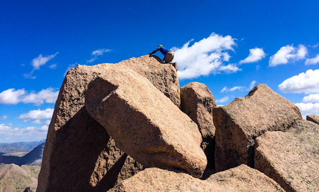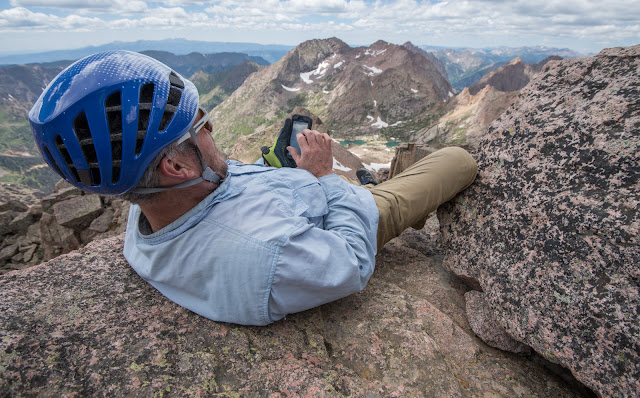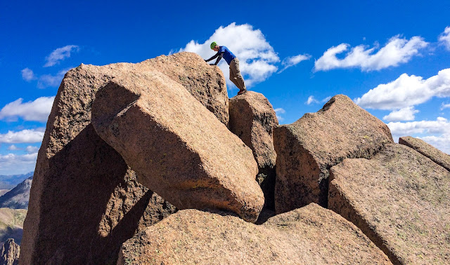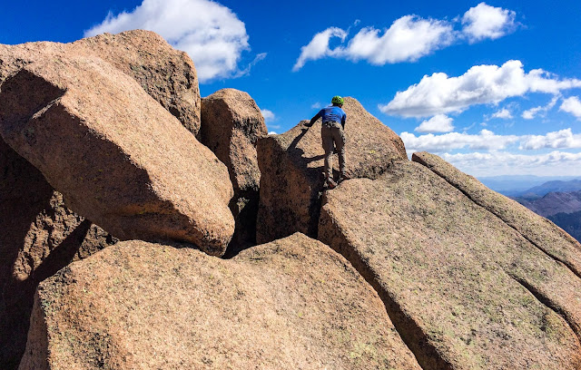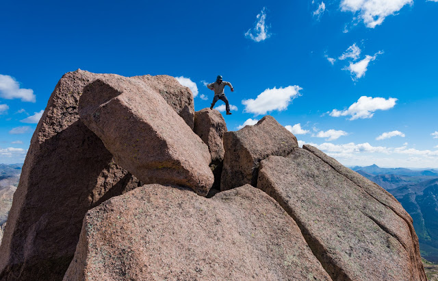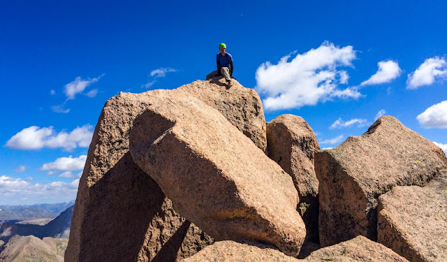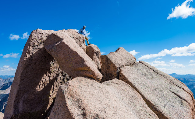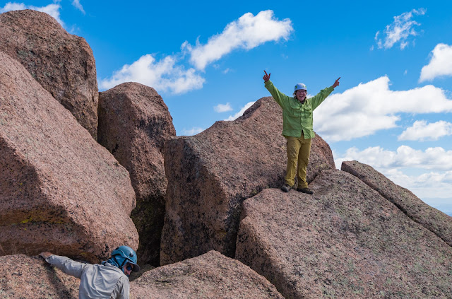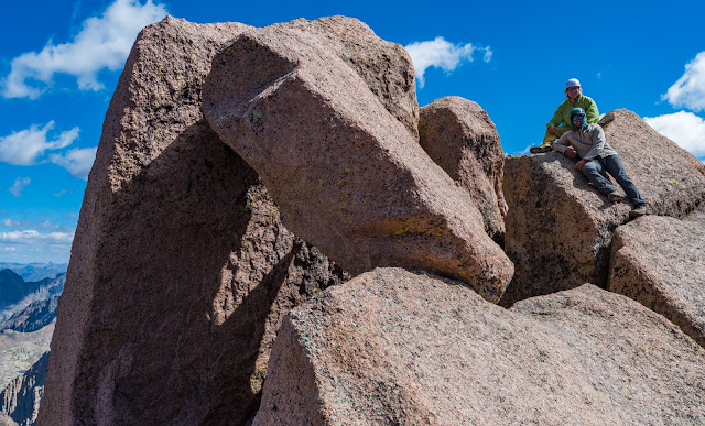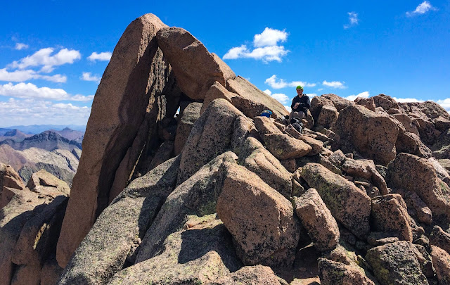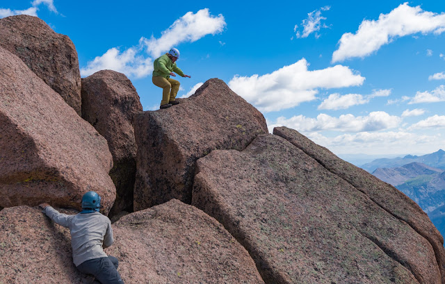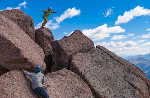 The very real potential consequences of this particular move constitute the collective reason why I stood for a time and pondered and did some praying before starting up the first major block of the final summit approach...I knew if I crossed that gap just before the summit I was committing myself to getting back safely, which likely meant making that consequential leap across the gap...I distinctly remember carefully lining myself up on the sloping block just before the gap, steeling myself, and jumping. Dave captured the latter part of my jump; if I'd had more presence of mind (there was a lot of nervous anticipation leading up to this summit) I would've swapped the camera into "high speed mode" which likely would've caught more of the action. I didn't get a picture of Dave making the jump, though he did (seeing him make it, I'm sure, encouraged me in having confidence about the nature of the jump itself and my - likely - ability to make it). Later we met two brothers on the summit and I was able to capture pictures of them making the jump. Between the pictures of Dave, me (including some from Dave's phone), and the ones I took of the brothers with my camera in "high-speed mode" this post includes the most comprehensive visual beta I've ever seen online for navigating the ascent and descent of the summit area on Sunlight Peak. - you know, in case you're curious about that.