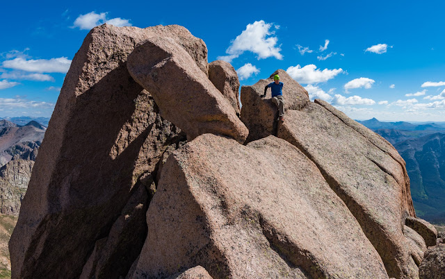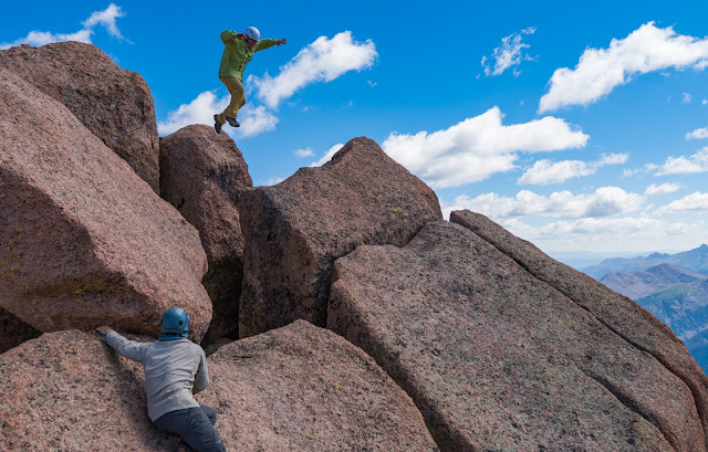 Some action shots of the two brothers who came up to summit Sunlight Peak shortly after Dave and I completed our own summits there. I offered to take some action shots of them making the jump and to send them the pictures after I got them edited some weeks after the trip; they agreed and thus I was able to do them a kindness while also gather some excellent examples of how significant a jump this is between the blocks...it's not your standard step across a little, though highly exposed, gap...
