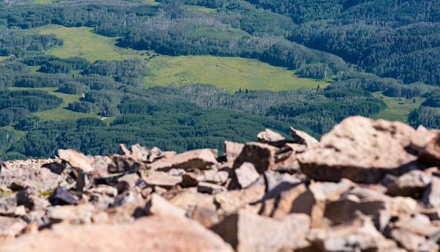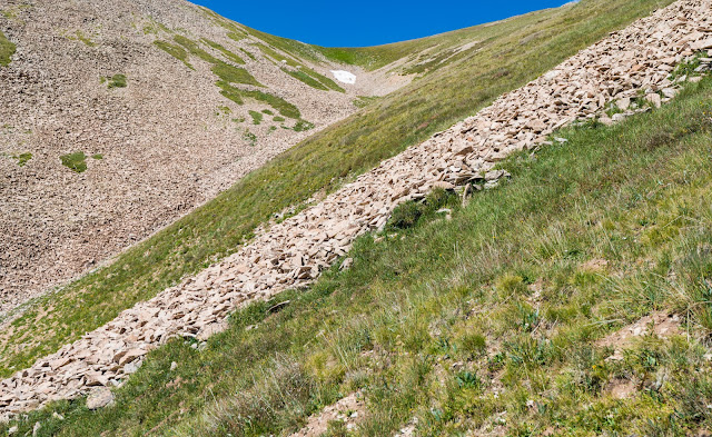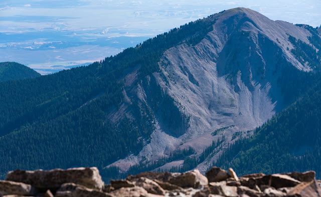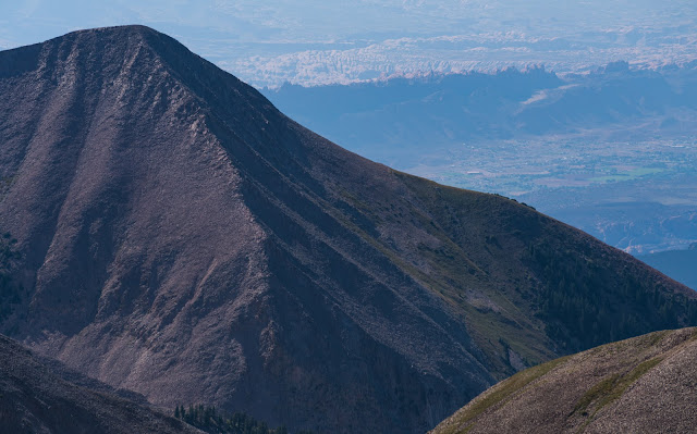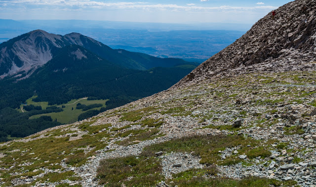 We ended up spending quite a lot of time on the summit of Mount Peale - probably about an hour - because the weather was good and the scenery was beautiful. Once we'd taken all the pictures we'd wanted to take we made a quick descent. On the way down we passed two gentlemen that worked for the forest service who had been out studying the impact of the mountain goats we'd seen on our ascent. Apparently the state of Utah had thought it would be a good idea to introduce mountain goats into this range - they're not native here, and the La Sals are surrounded by vast tracts of complex desert terrain that would've stopped any natural migration of the critters to the area on their own. The La Sals, like the Deep Creek Range in far-western Utah and the Wheeler Peak area of Nevada, are sometimes called "sky islands" because they are so much higher than the surrounding area they literally have a different climate than the entire area around them and species of plants and animals that couldn't survive the harshness of the desert thrive up there...The forest service counseled against bringing in the goats, arguing that they would have a negative/invasive role on the extant environment out there in the La Sals, but the state brought the goats in anyway - by helicopter! Anyway, these two had been out there the whole time we were on Mount Peale (and likely for some time before that) studying the physical impact of the goats on the area, so we chatted with them a bit about that stuff before continuing our descent past them down the huge gully.