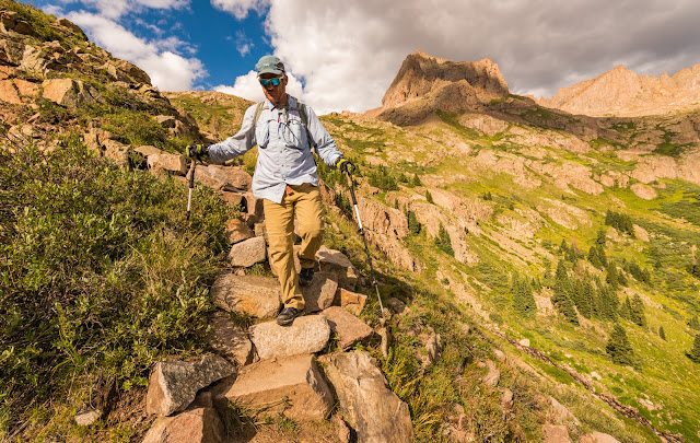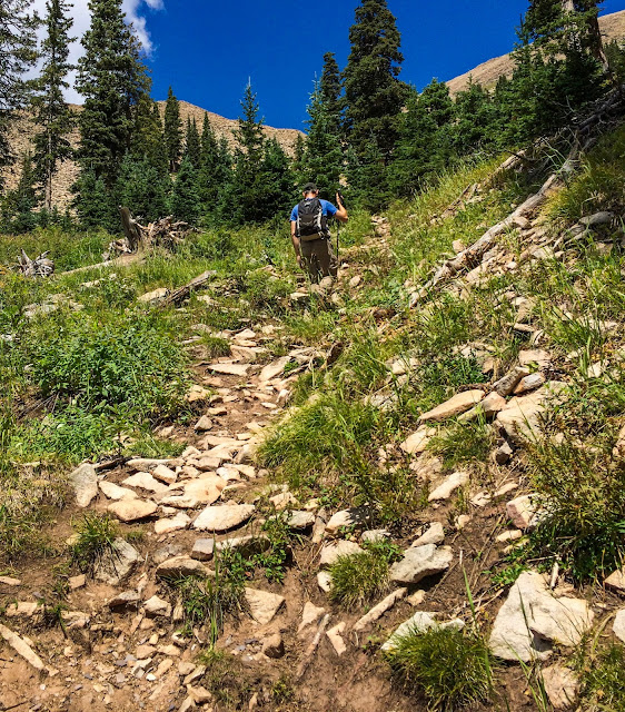 Dave descends steep trail as we work our way down from Twin Lakes to our camp in Chicago Basin.