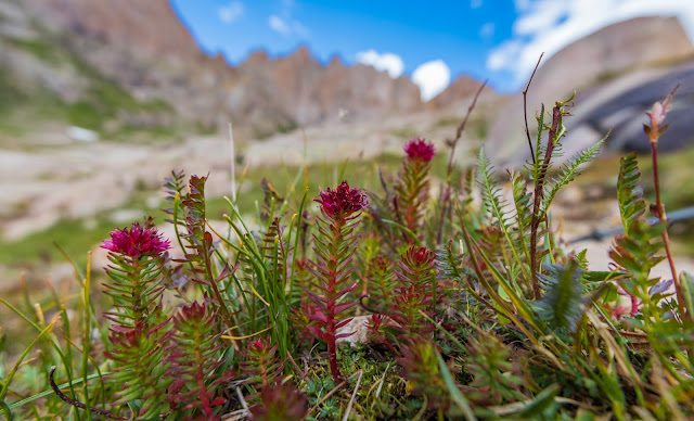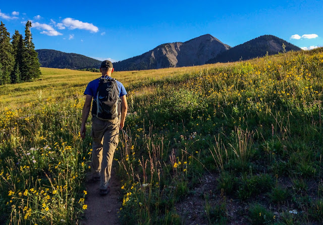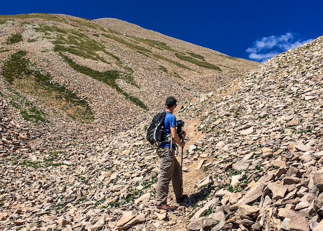 There were some thicker clouds when we first started up from La Sal Pass, not especially threatening, but the kind of clouds you learn to keep a close eye on when you're out in high elevation territory like this. Happily, the clouds cleared up for us and we hiked under halcyon skies all the way to the top.