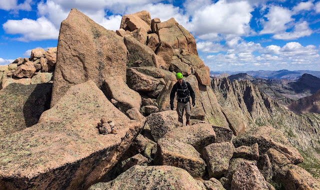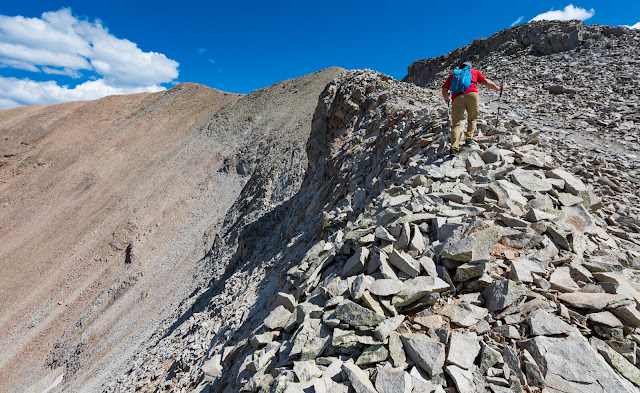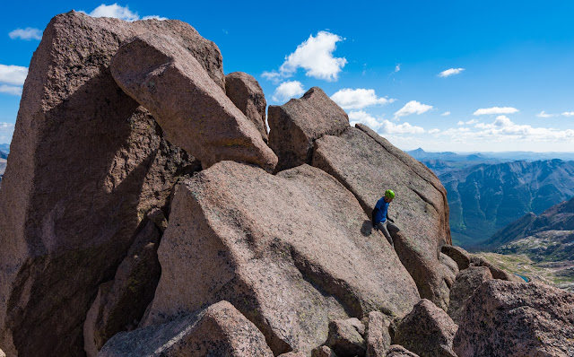 Dave works up the ridge toward Mount Peale (which is on the left here. This is about as scary as this ridge looks/gets, and this was only momentary. Most of the terrain is very straightforward and, if you look close, you can follow a use trail that's developed through the boulders to the top...