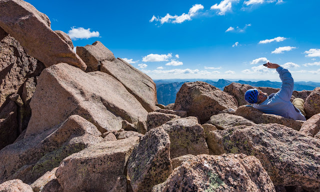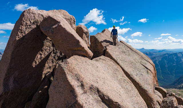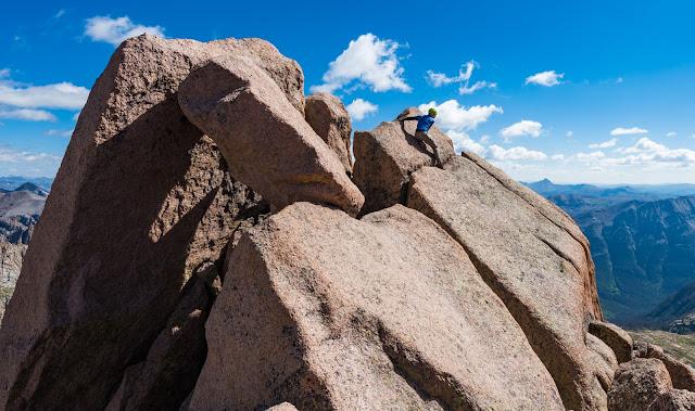 Dave takes a slightly wider shot, trying to convey how severely exposed this summit is...you just can't tell from anywhere except the summit block and the last block before it how exposed that entire side to my right is...My right foot is literally dangling in empty space above hundreds of feet of nothing to stop my fall in this shot...Wild and unforgettable!