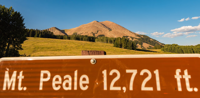 Snagged this picture of the sign and Mount Peale shortly before getting into the car to head to Maob for dinner, and - from thence - homeward. There used to be a much more interesting wooden sign in this area but someone stole it, so they installed this metal one...You may recall me listing the summit elevation of Mount Peale at 12,726 feet. Well, sometime after this sign was put in, a new survey of the land via satellite was done that showed a lot of the mountains across the western US were about five feet higher than previously listed...so...not a huge difference, but if it means I climbed a bit higher than I previously thought I did that's not a bad thing...