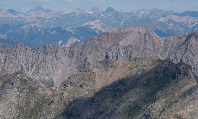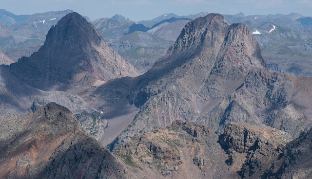 One more shot of Sunlight Peak and sunlight Spire from somewhere on Windom Peak. Again, notice how steep the terrain is, both in the terrible chute of red-orange rock and as you're scrambling across the front of Sunlight Peak itself. Pretty intense peak, but, overall, a lot of fun if you're ready for it.