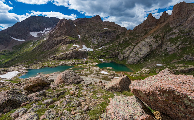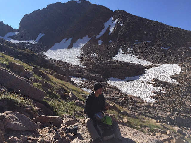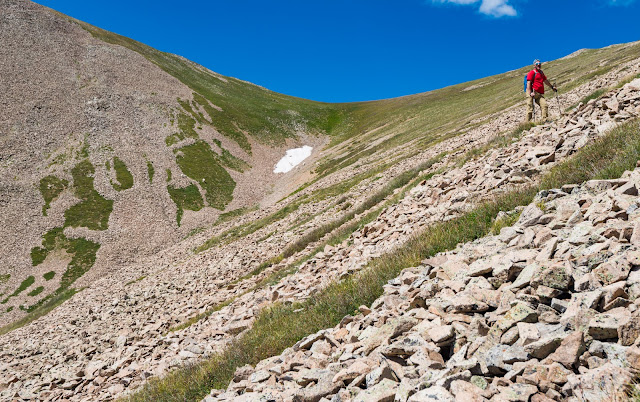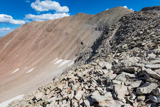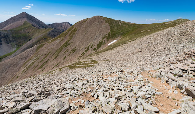 After a little time re-fueling and hydrating ourselves we continued our ascent out of the Twin Lakes area, this time in the opposite direction from the day before. We'd decided to hit Sunlight Peak first, since there terrain there was substantially more complicated and we figured we could make a quicker ascent and descent of Windom Peak if necessary thereafter in case the weather started looking chancy...
